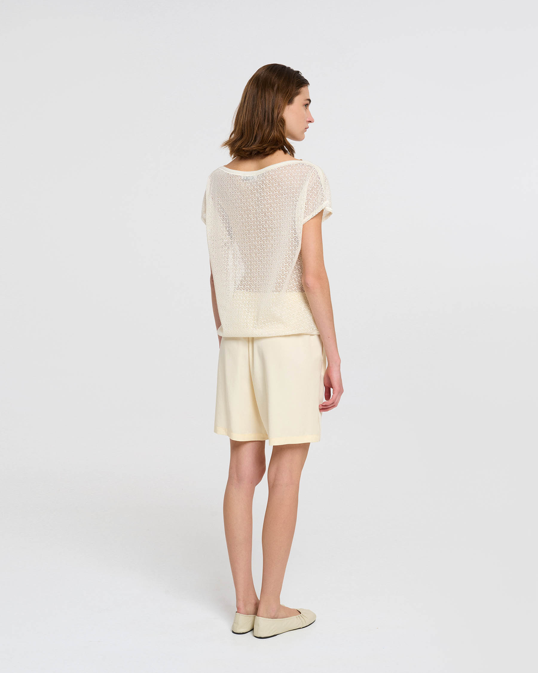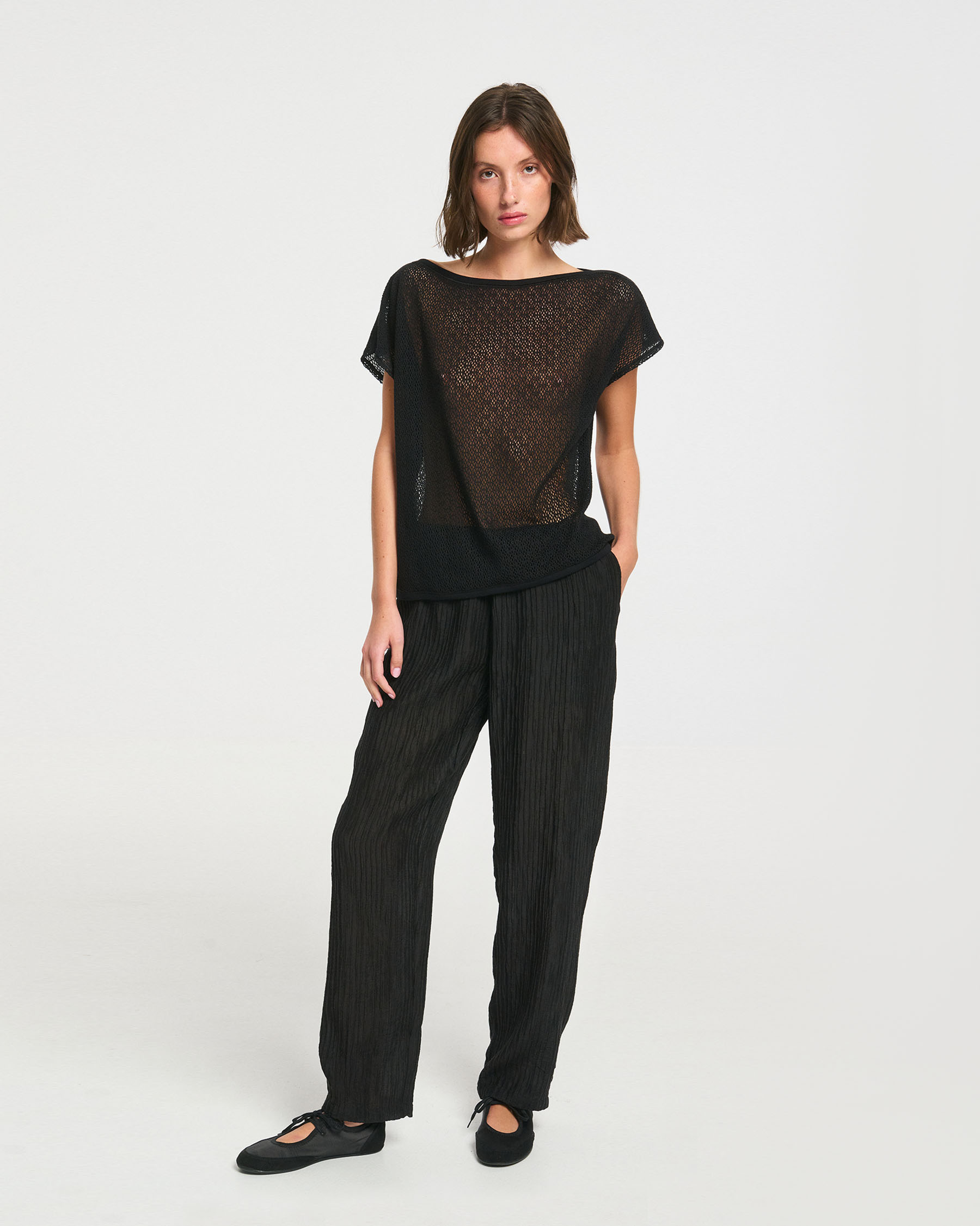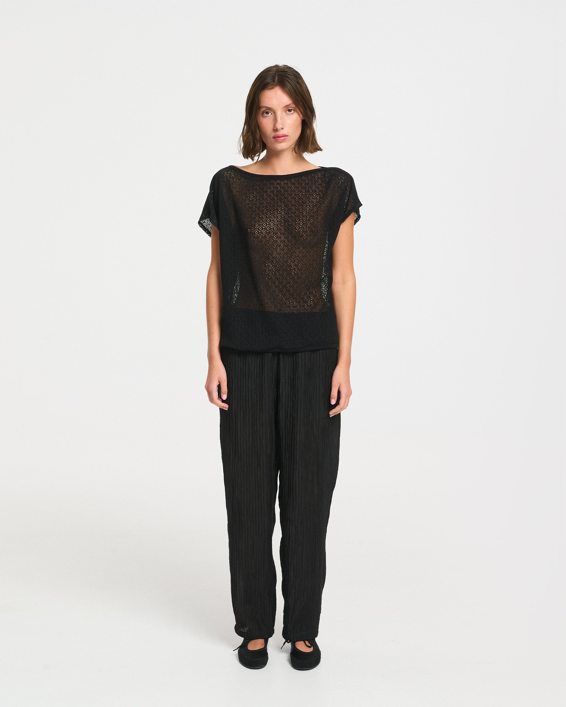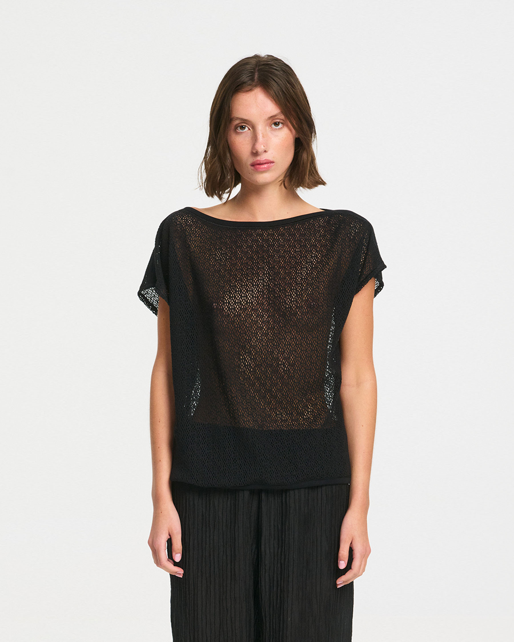 Αμάνικη κοντή μπλούζα bateaux σε βαμβακερή δαντέλα δίχτυ. Κατασκευάζεται στην Ελλάδα.