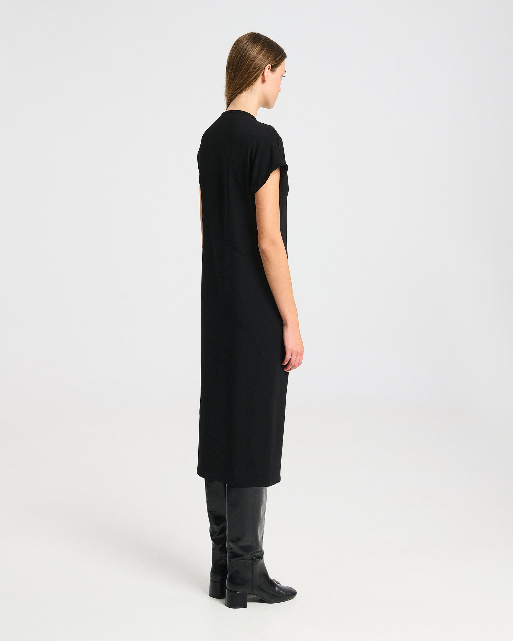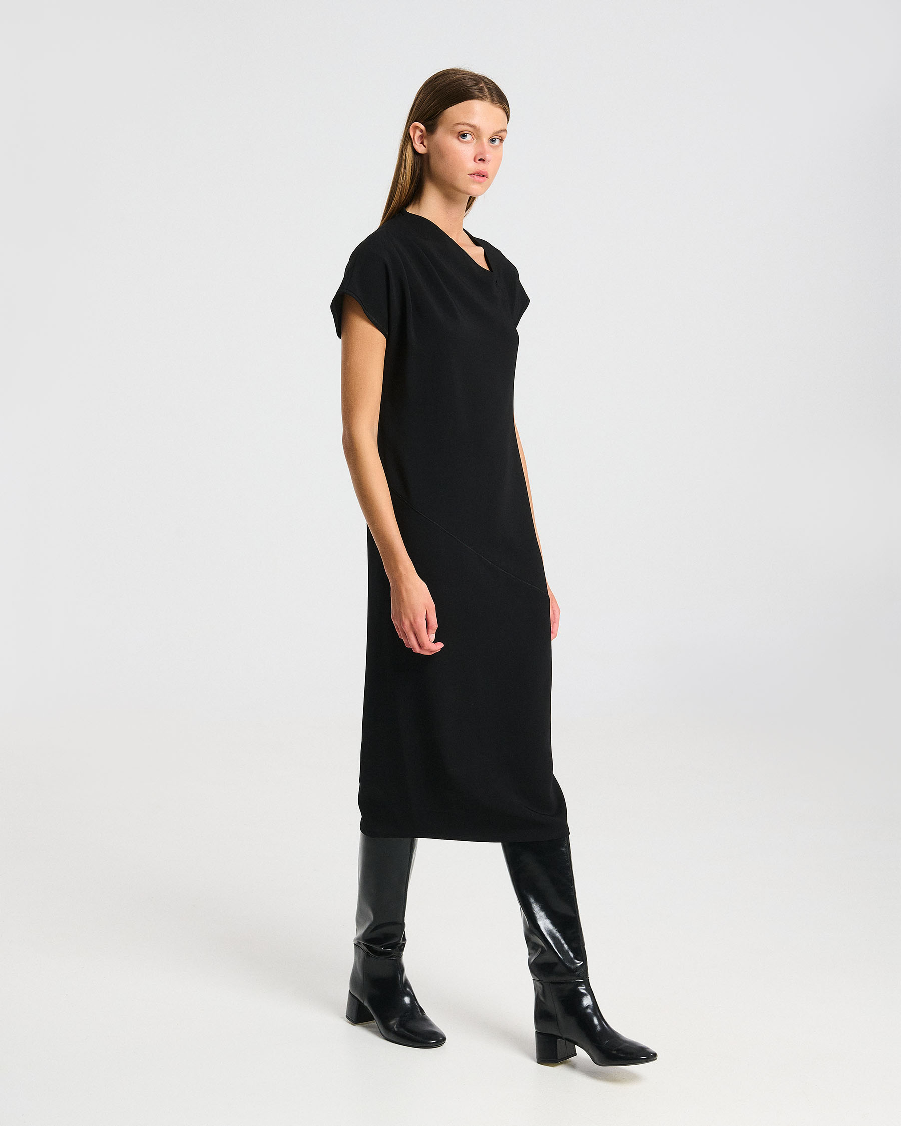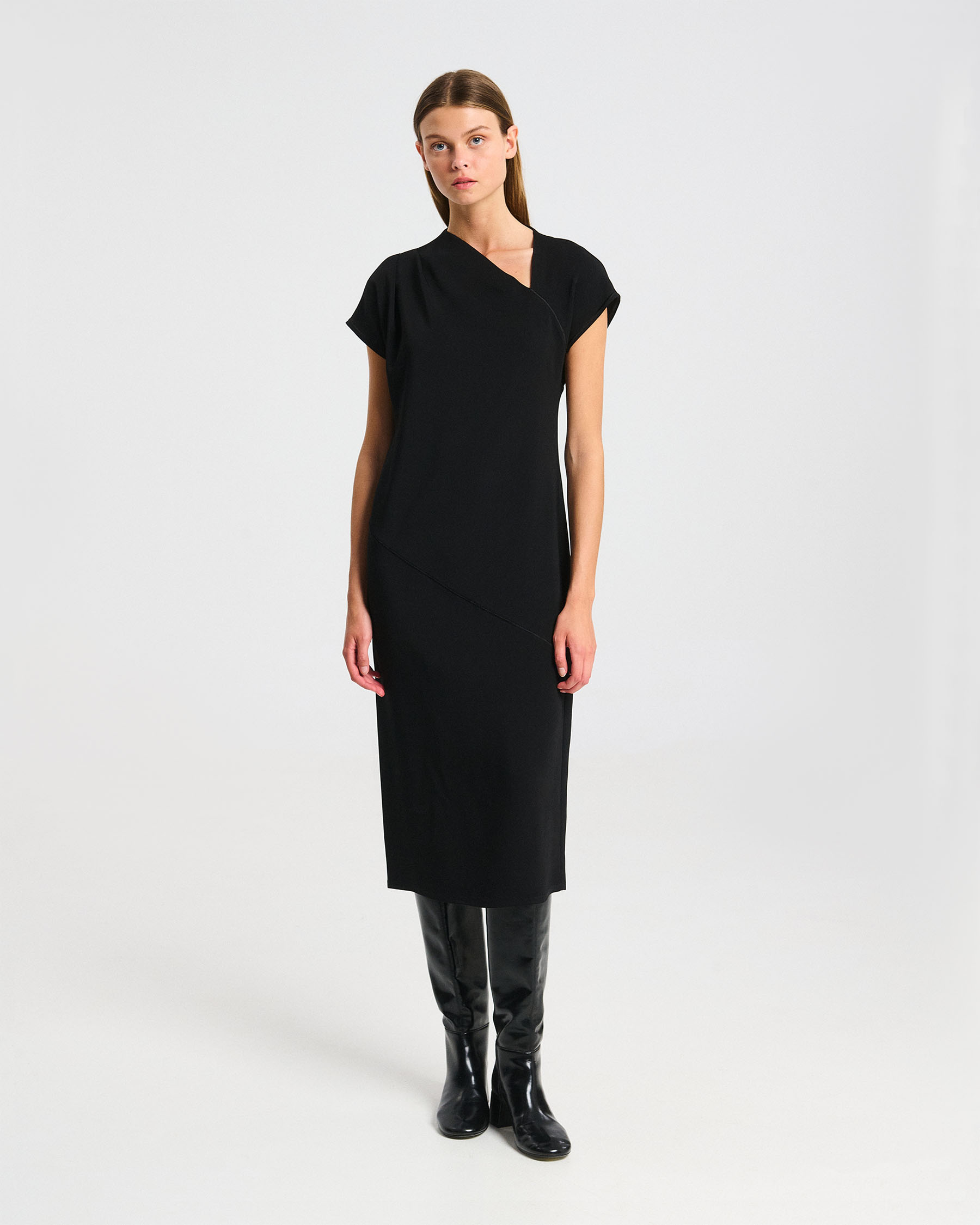 Αμάνικο crep rayon στενό μίντι φόρεμα με ασύμμετρο V. Κατασκευάζεται στην Ελλάδα.