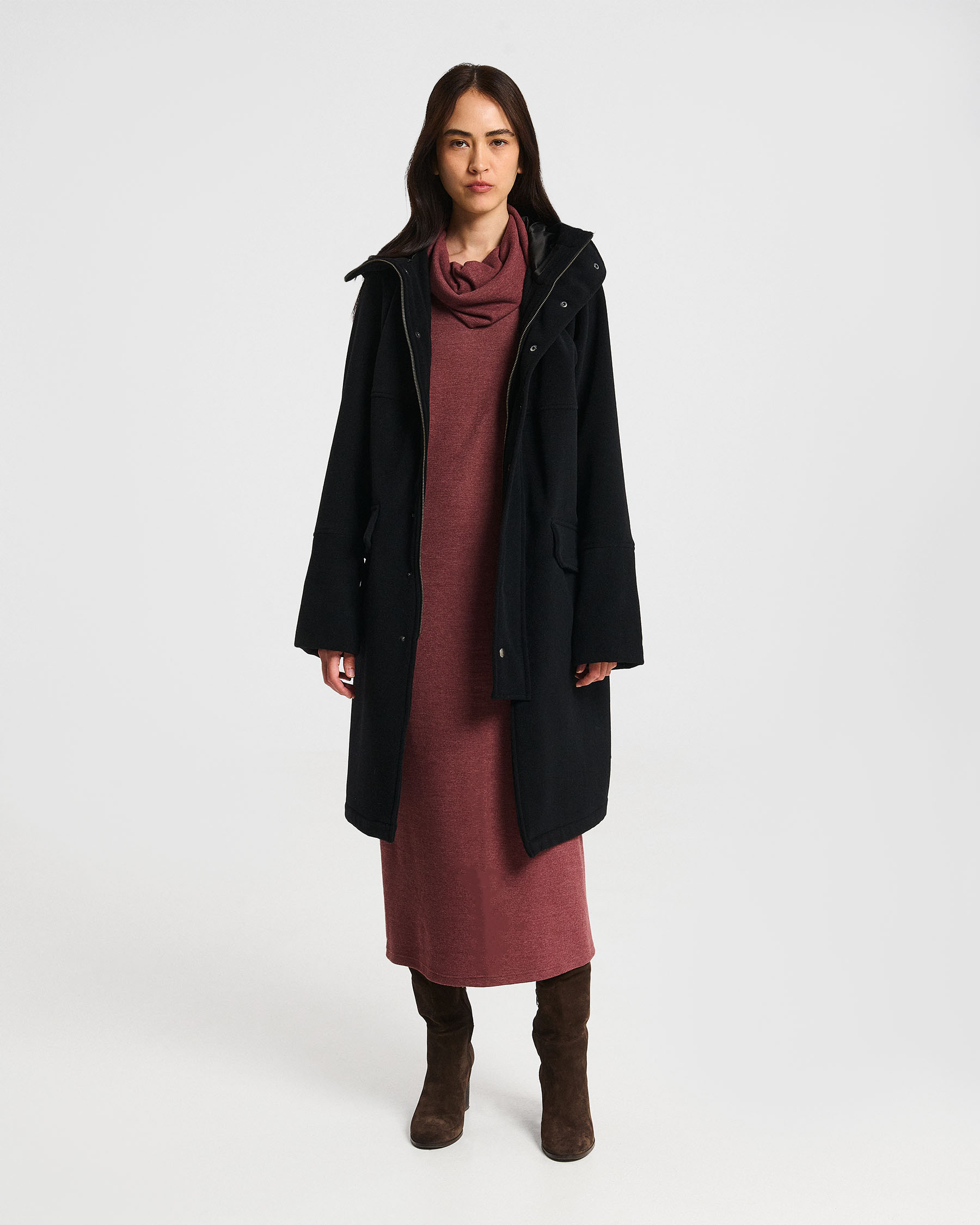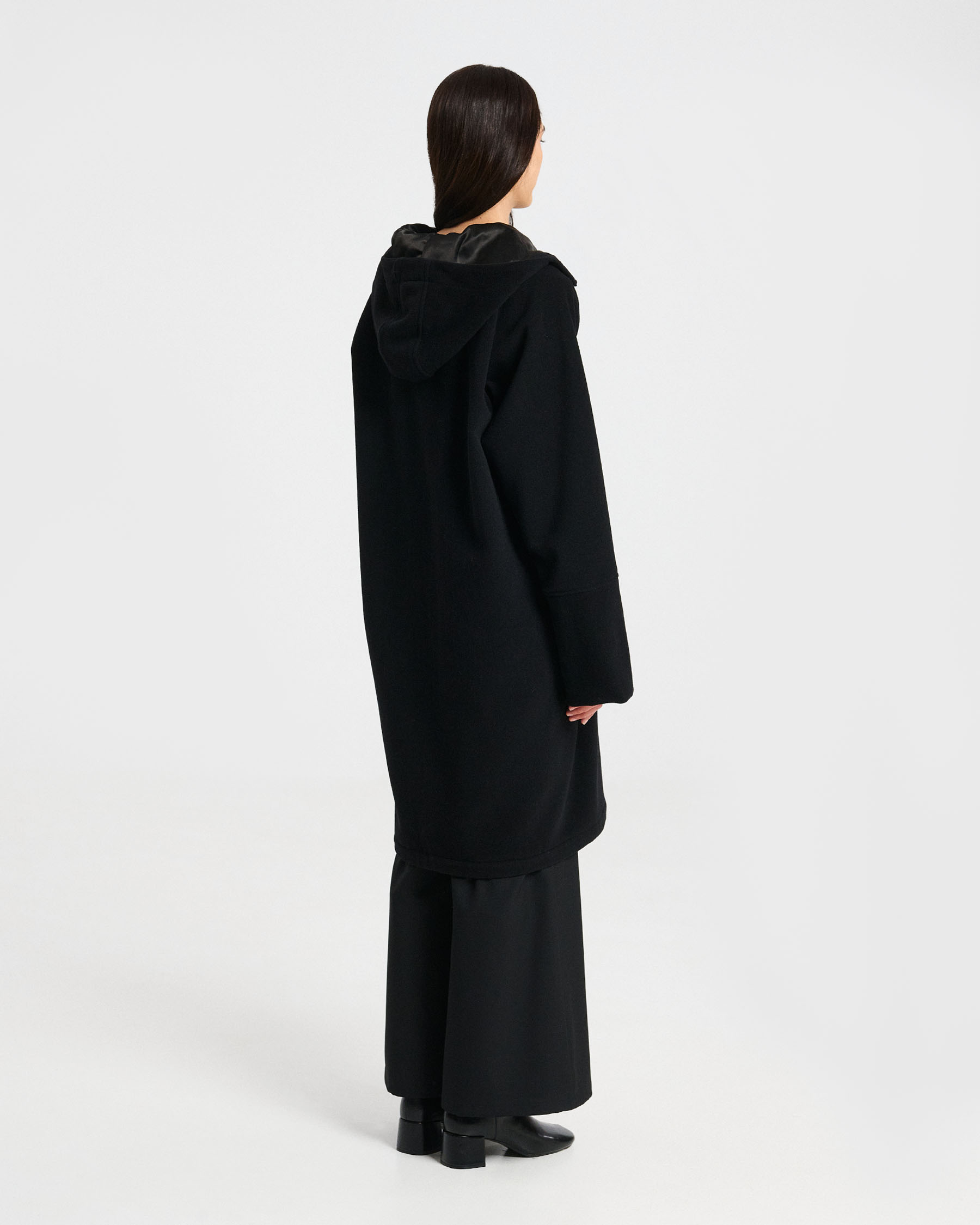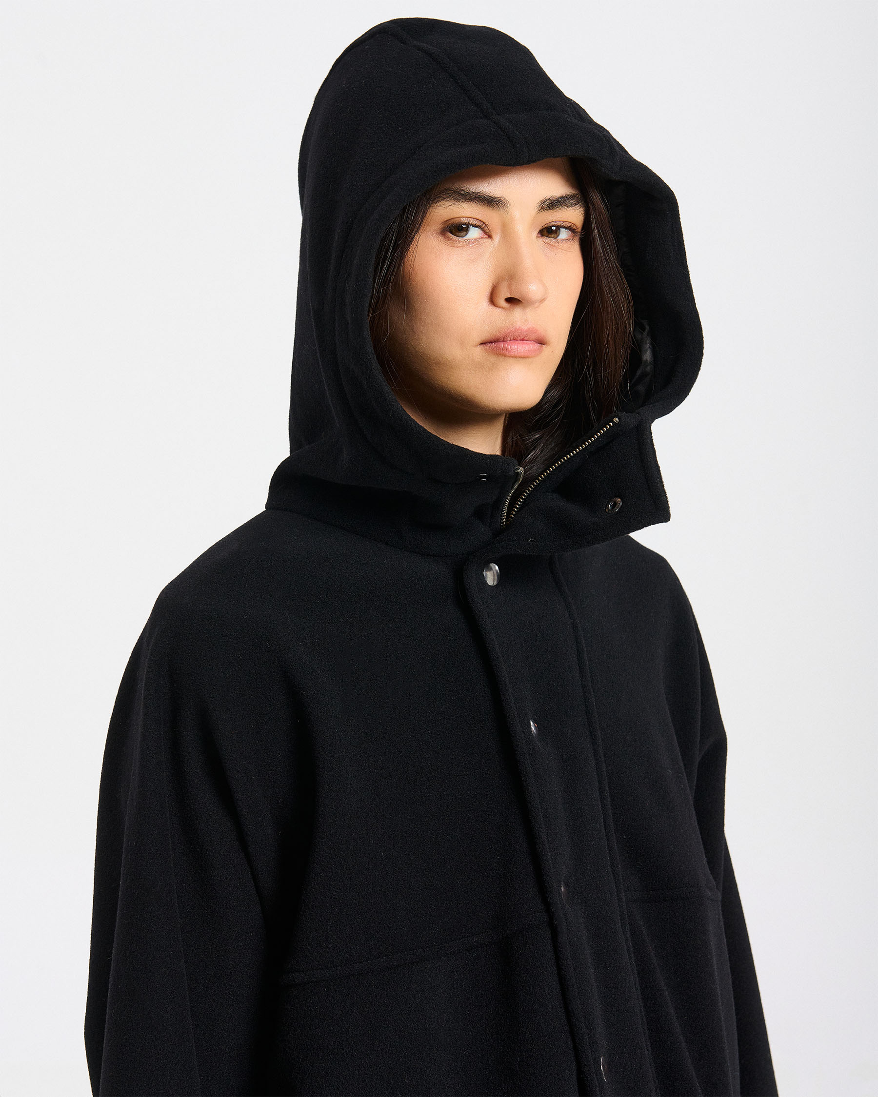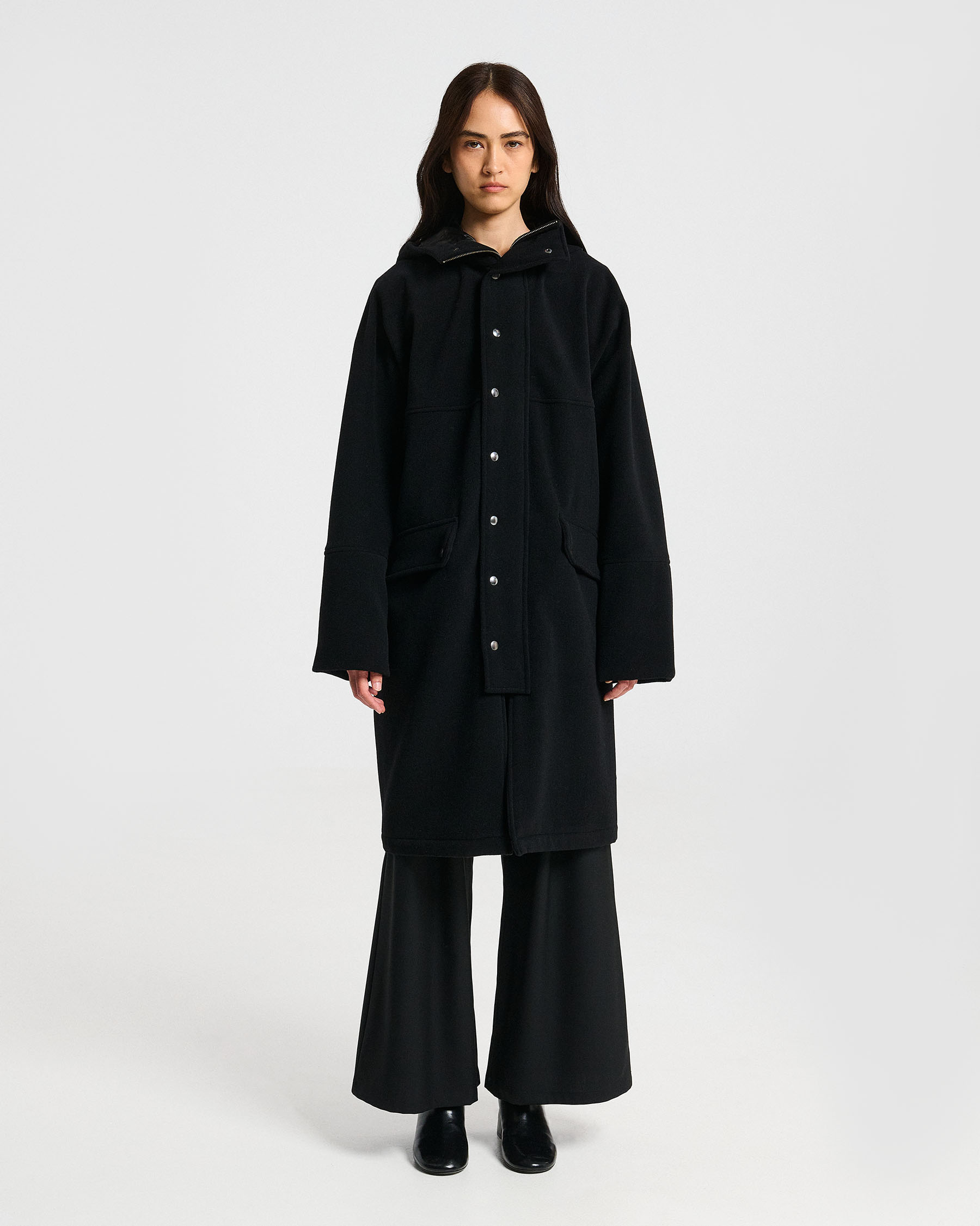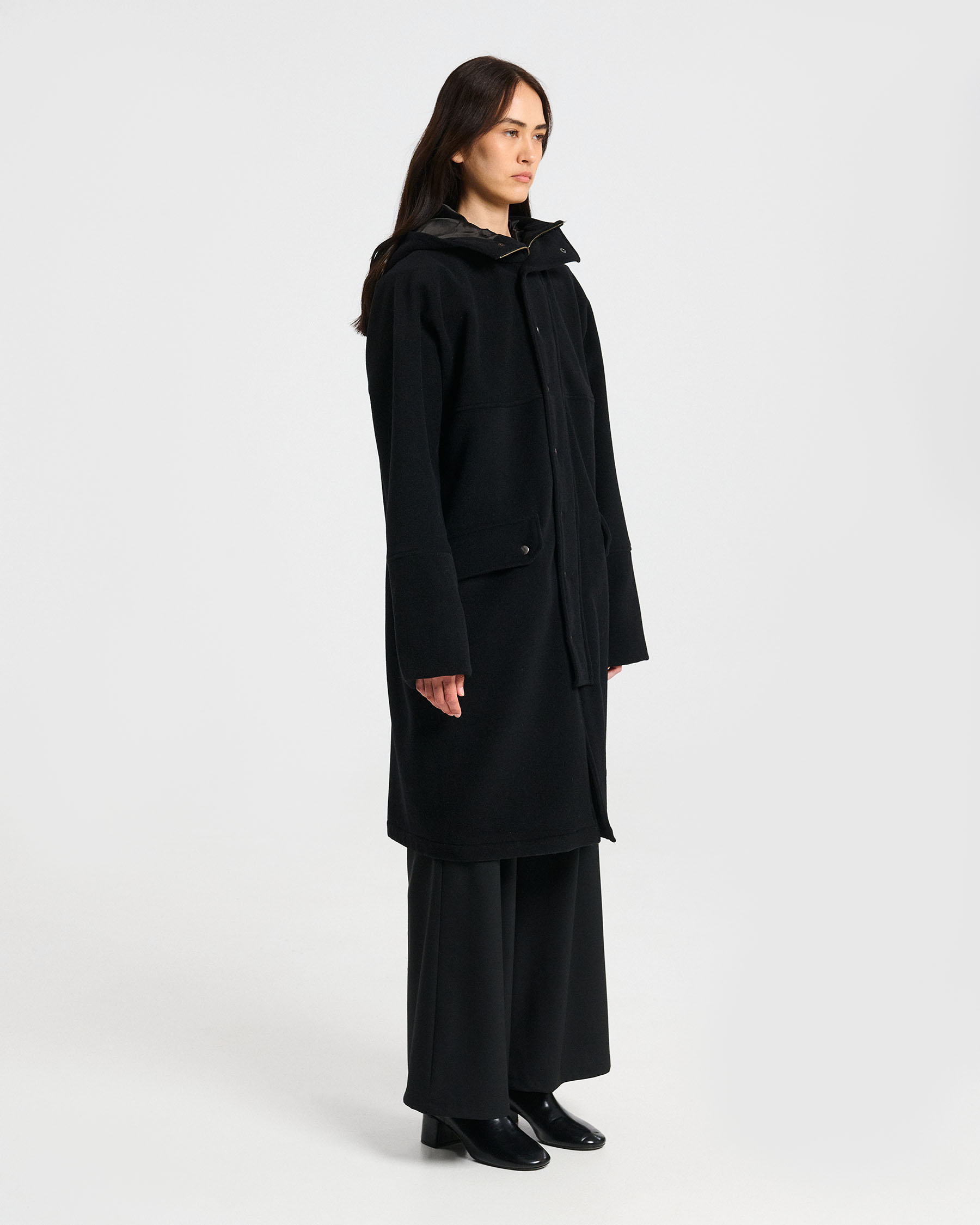 Μάλλινο παλτό με κουκούλα, φερμουάρ και ντρουκ και εξωτερικές τσέπες με καπάκι. Κατασκευάζεται στην Ελλάδα.