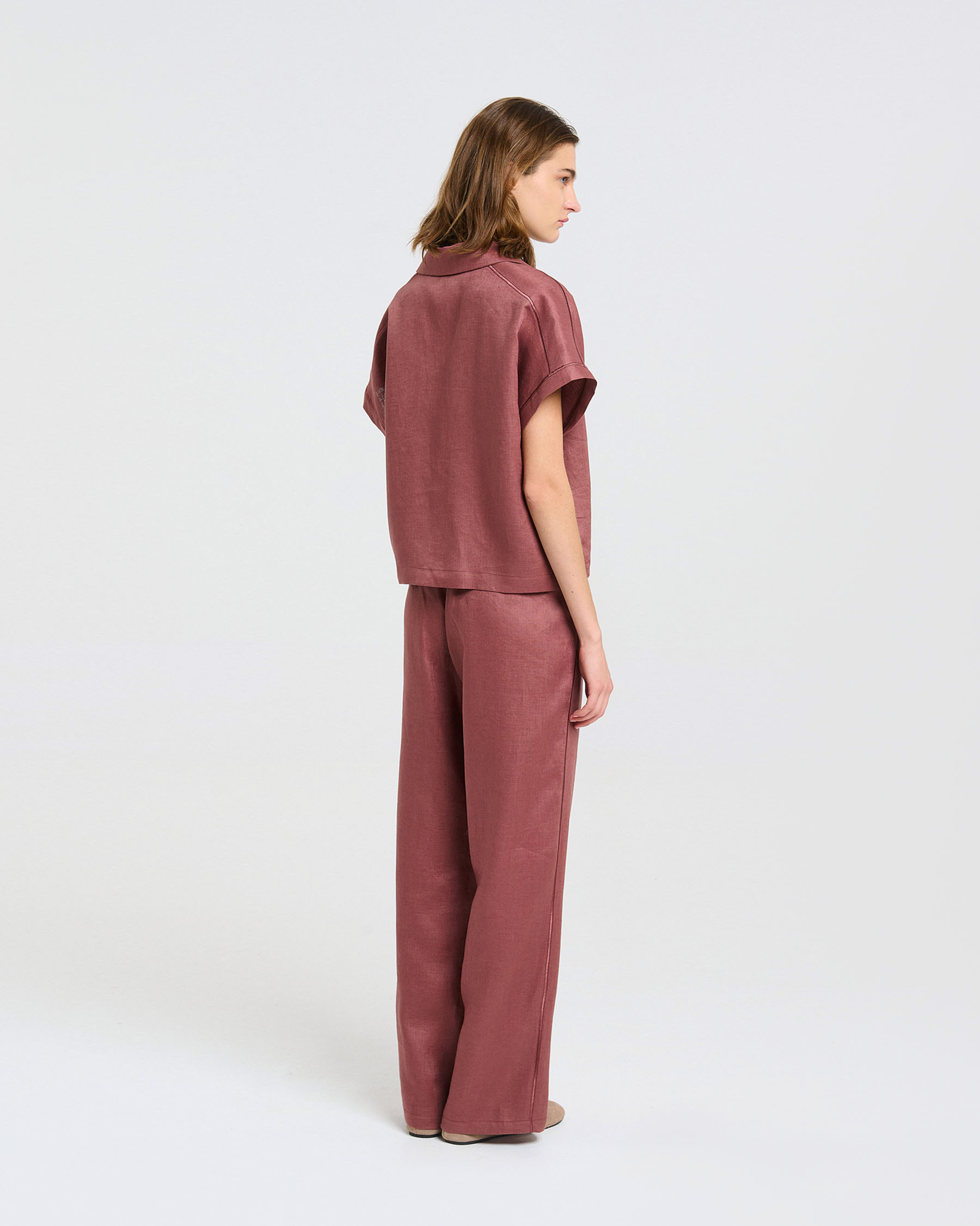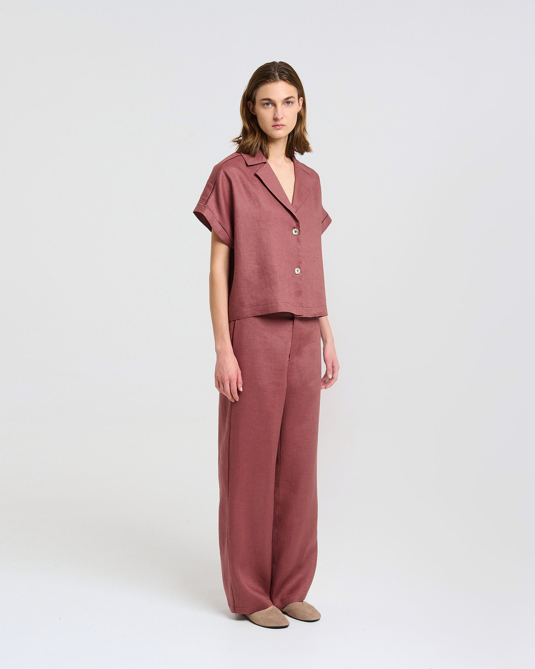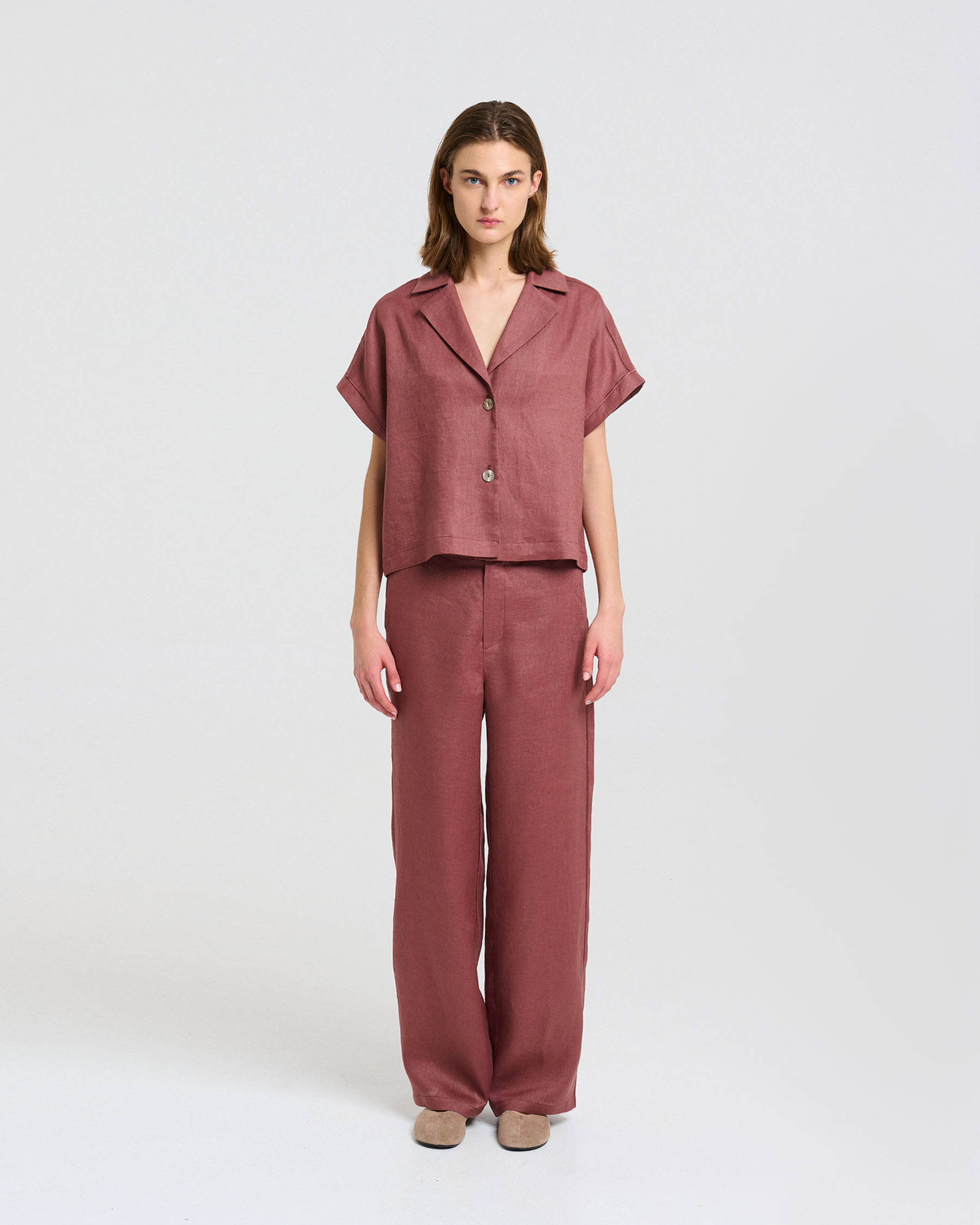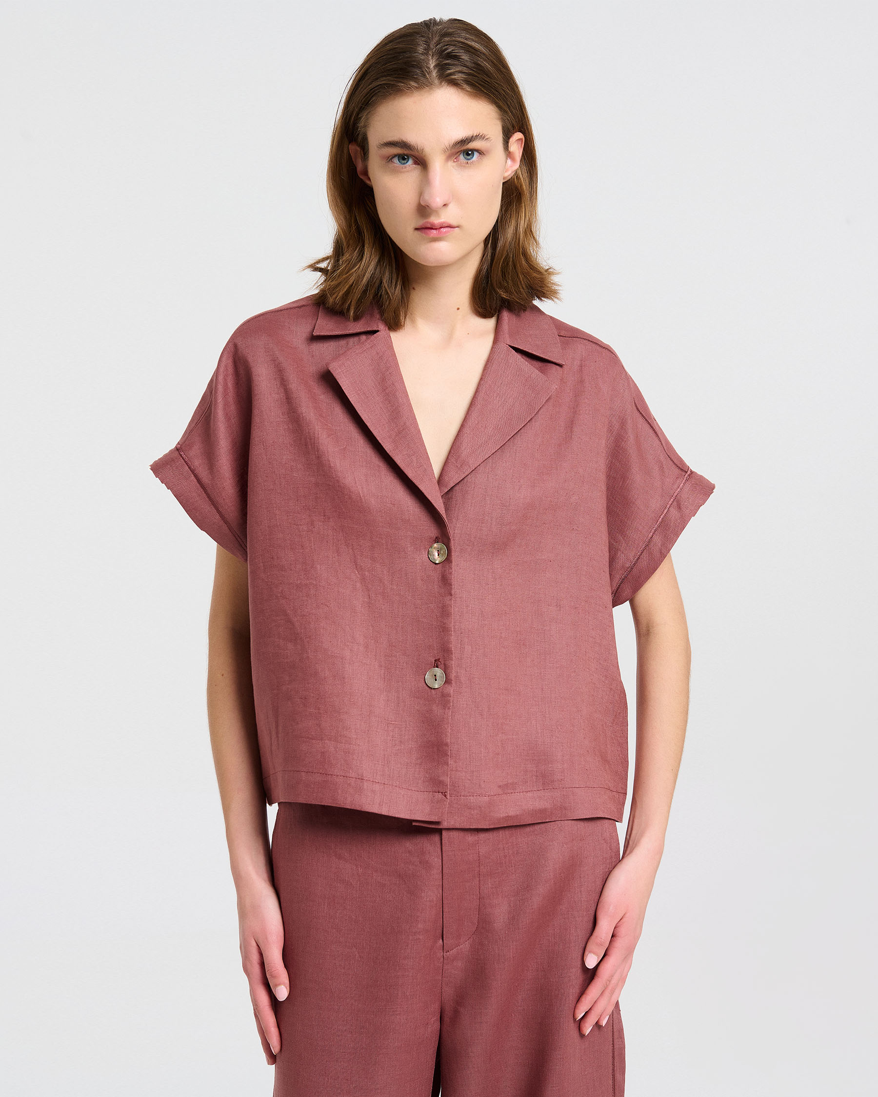 Λινή κοντή φαρδιά κοντομάνικη ζακέτα με πέτα. Κατασκευάζεται στην Ελλάδα.
