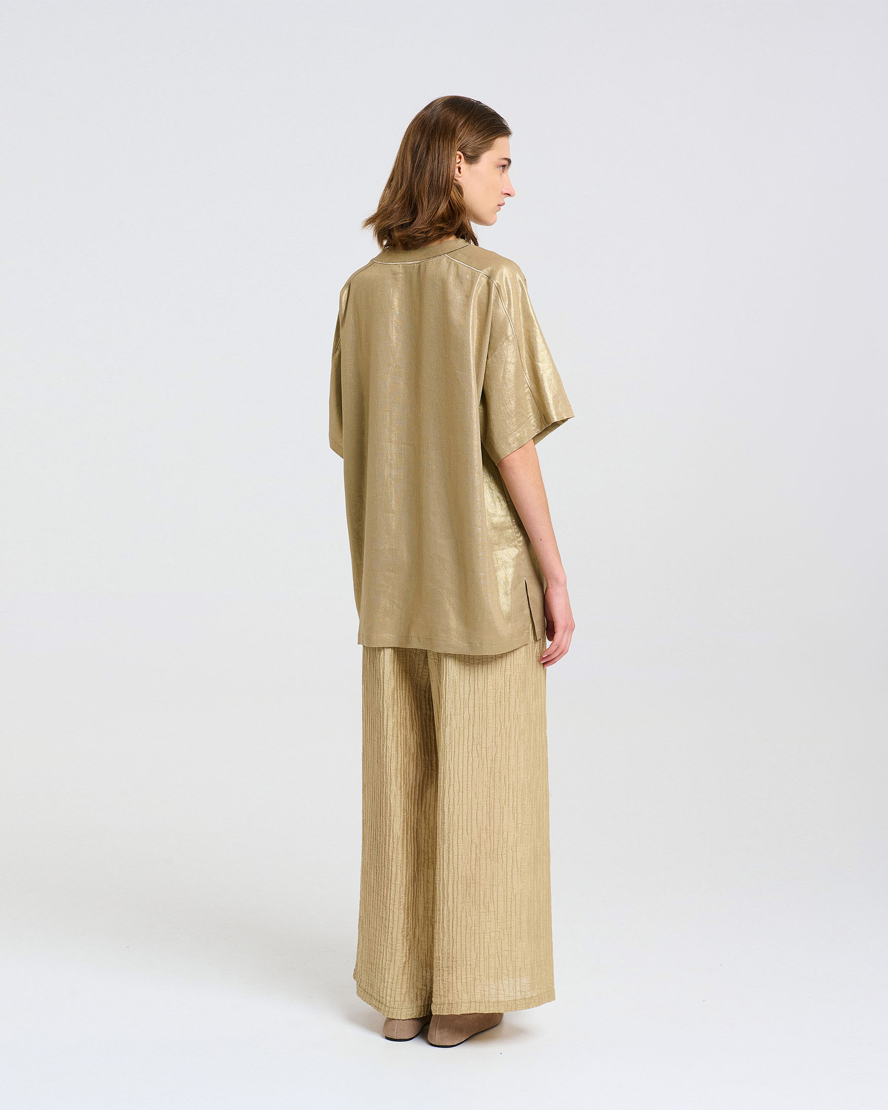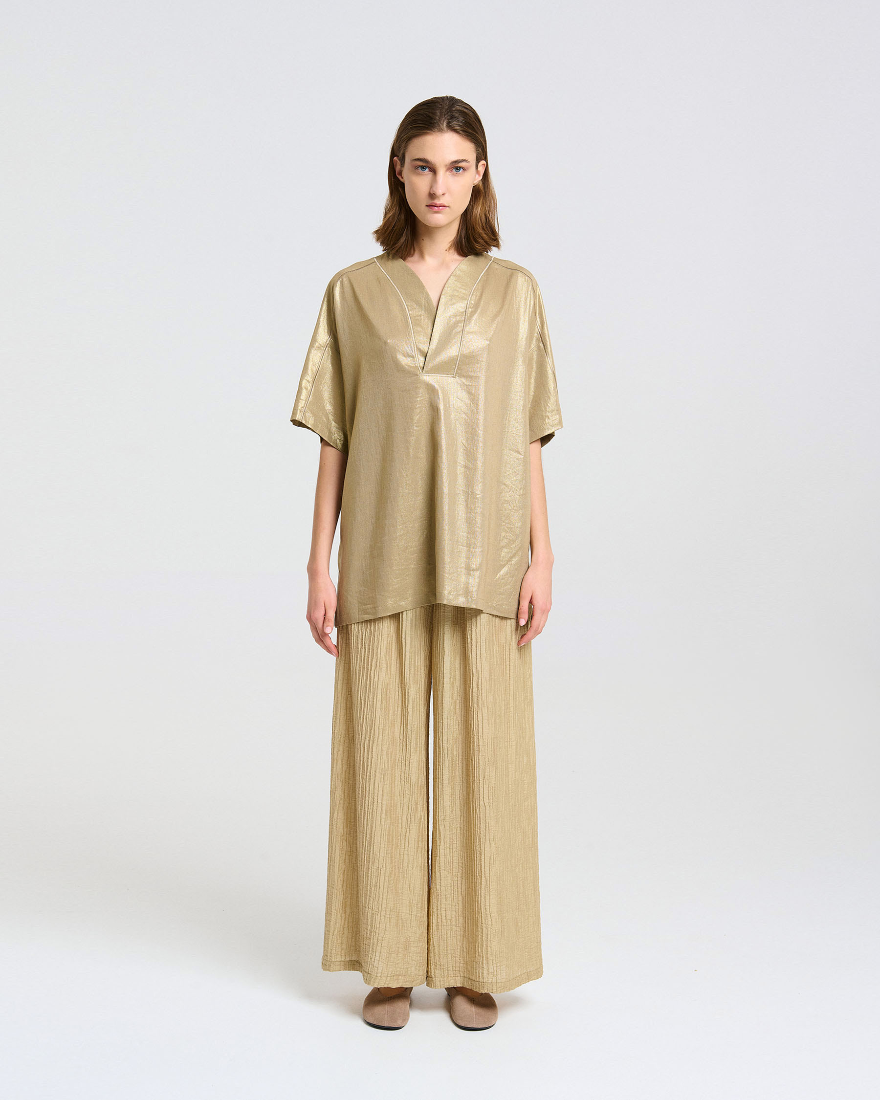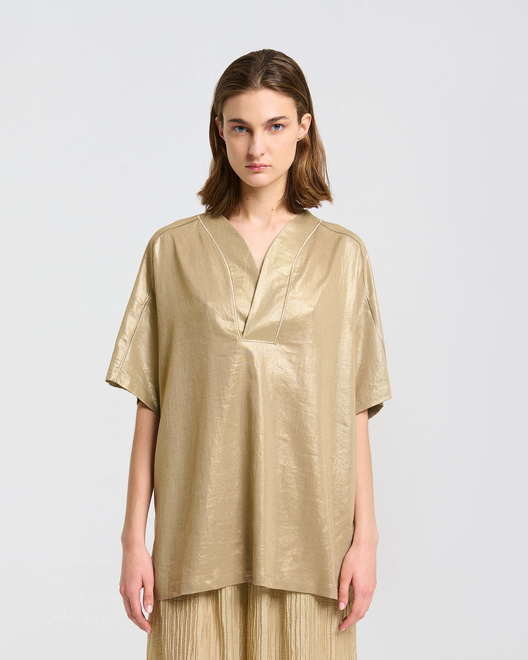 Κοντομάνικη φαρδιά μπλούζα με σταυρωτό V σε λινό/bamboo με χρυσή επικάλυψη. Κατασκευάζεται στην Ελλάδα.