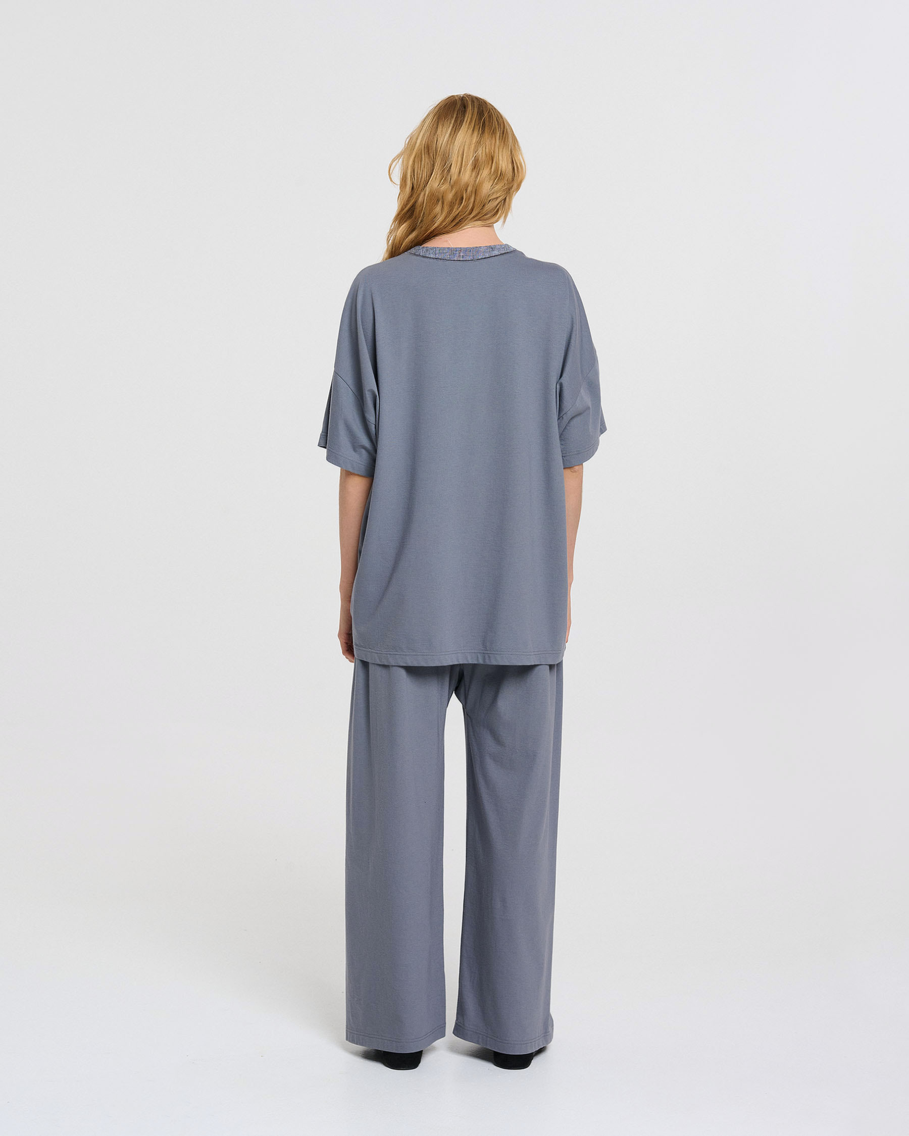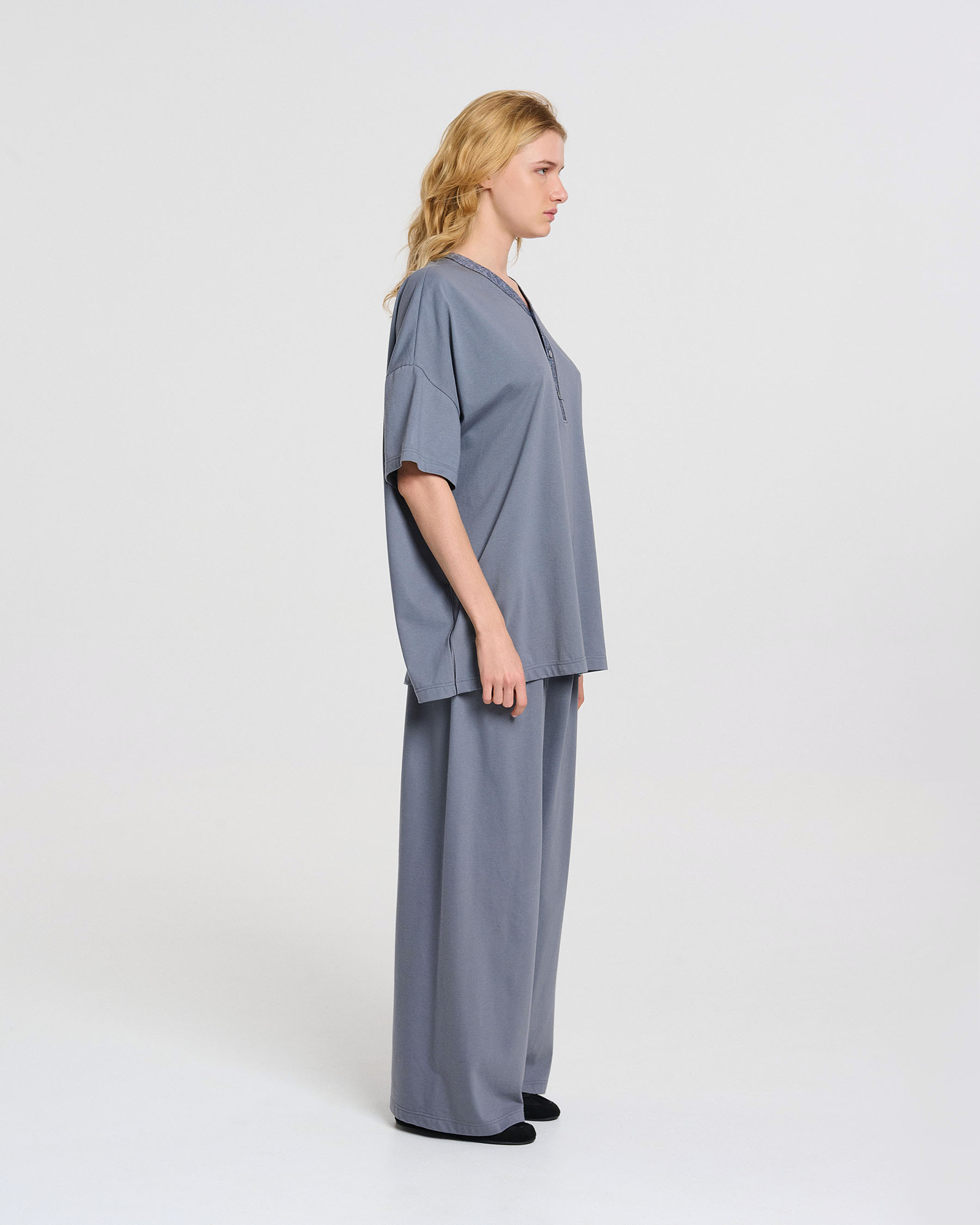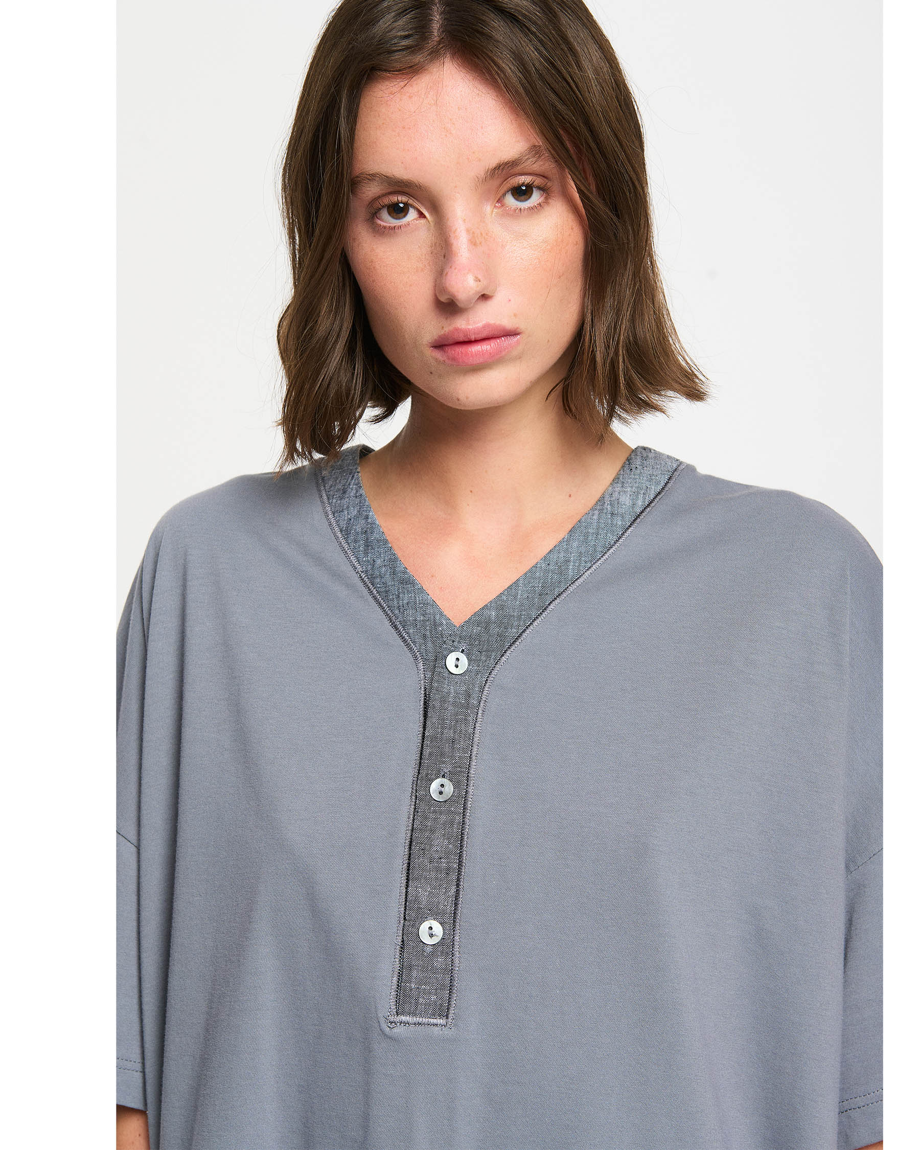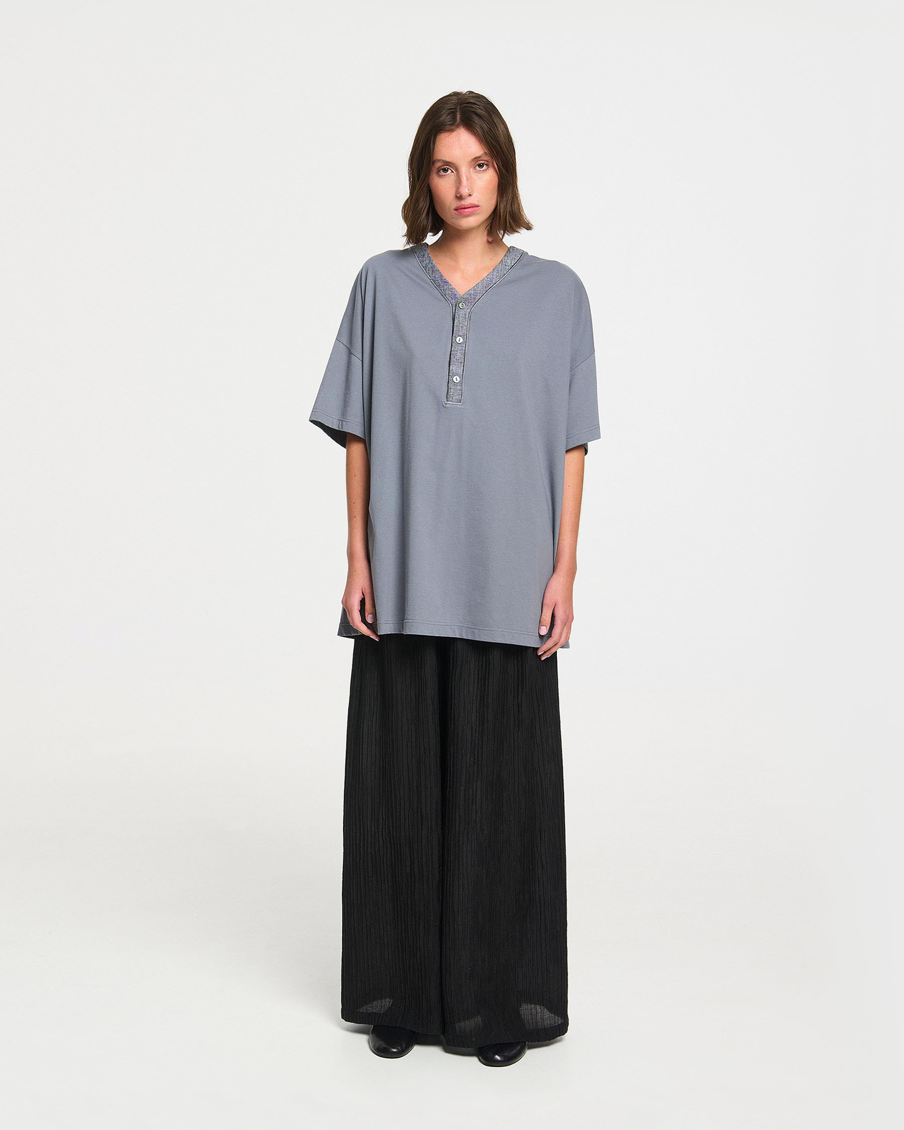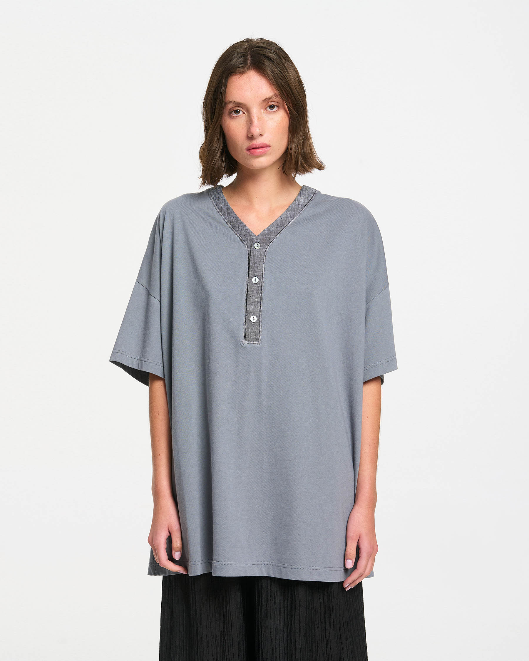 Πολύ φαρδιά κοντομάνικη βαμβακερή μπλούζα με V και λινή πατιλέτα. Κατασκευάζεται στην Ελλάδα.