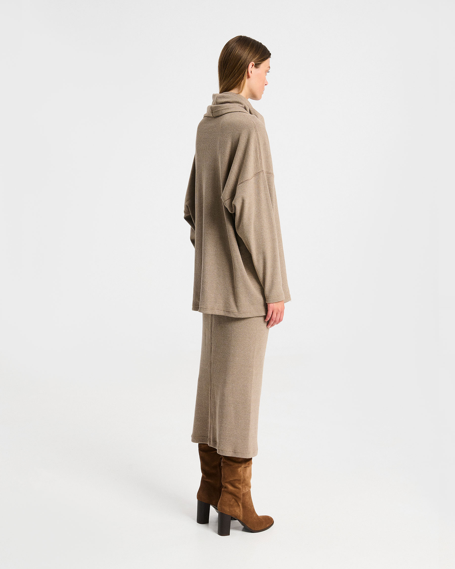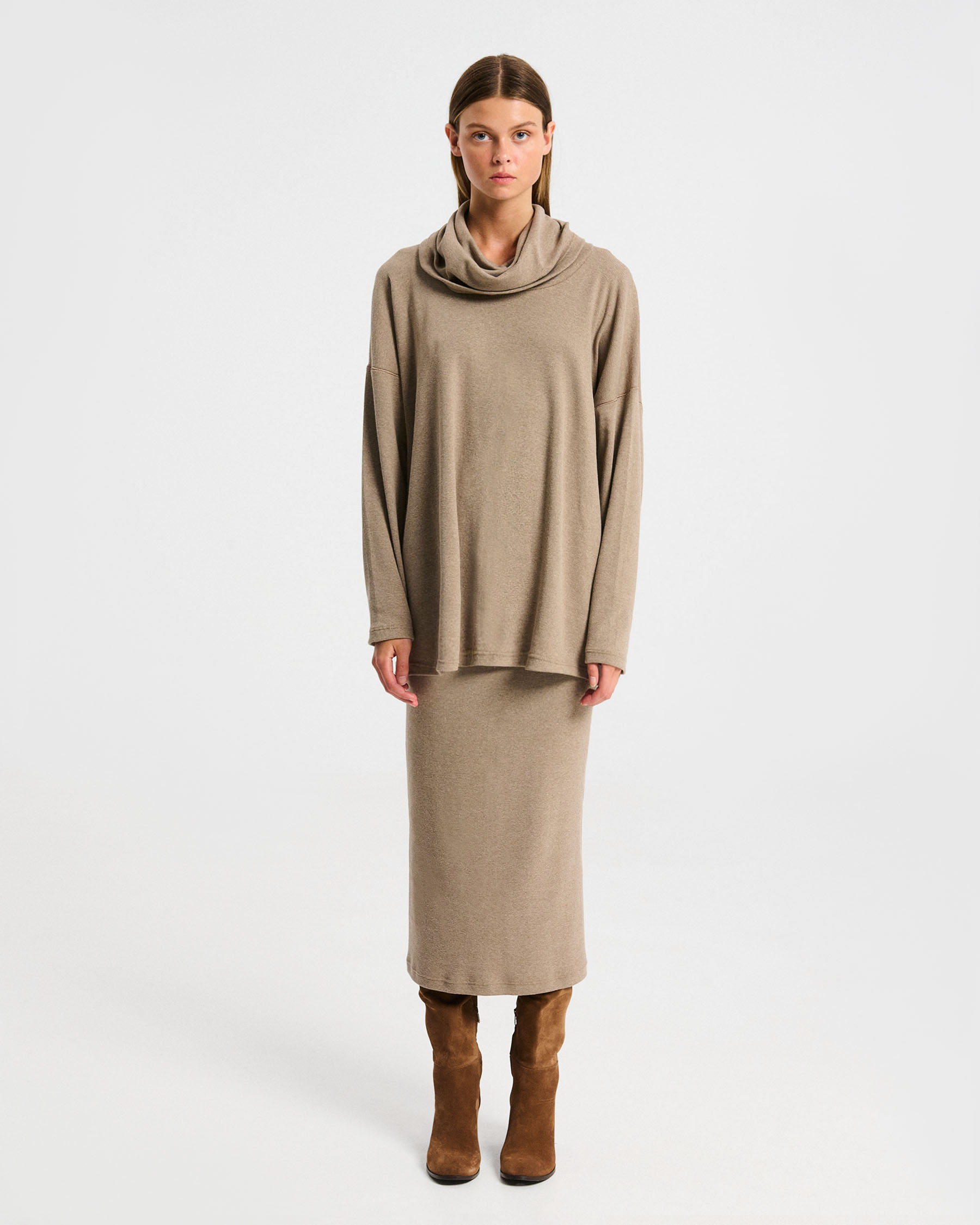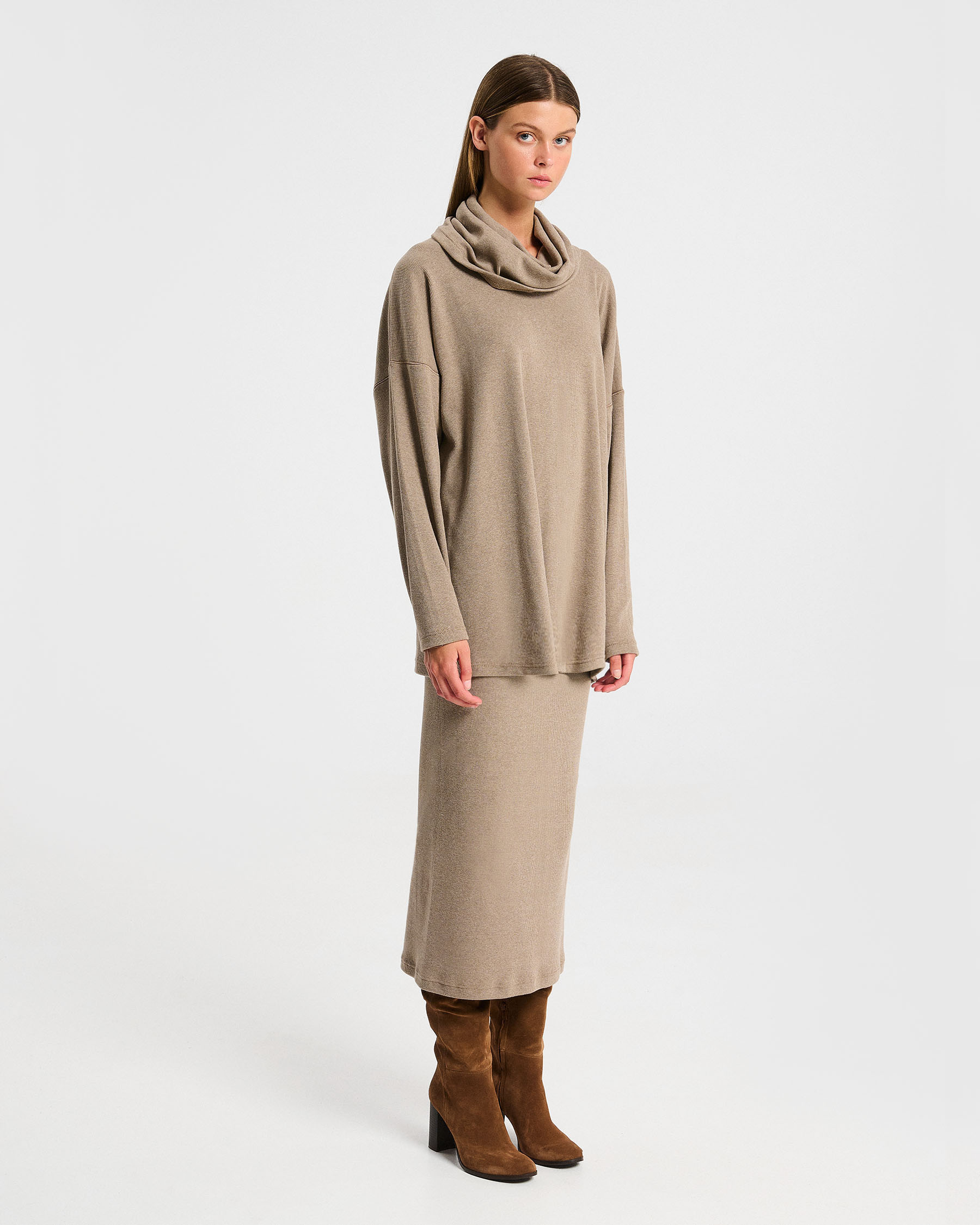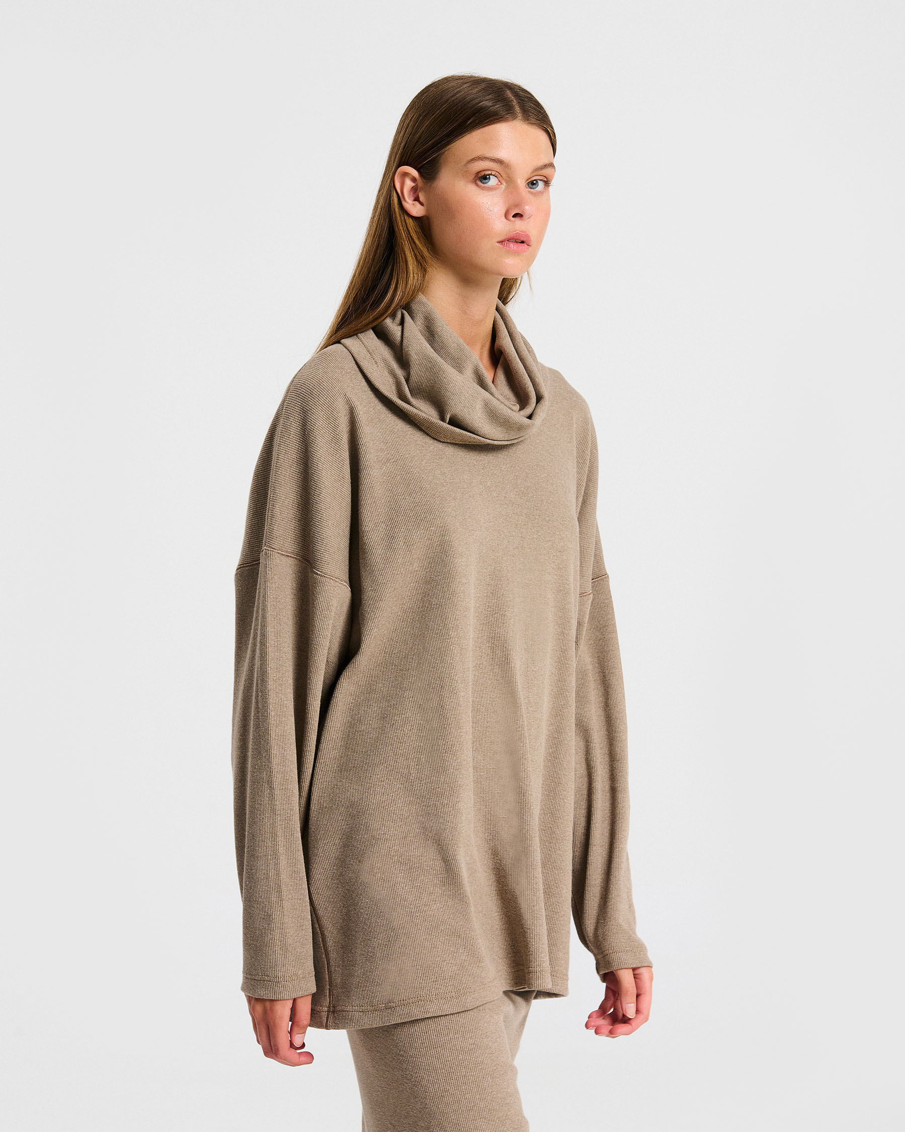 Πολύ φαρδιά μακρυμάνικη βαμβακερή ριπ μπλούζα με ξεχυλωτό γιακά. Κατασκευάζεται στην Ελλάδα.