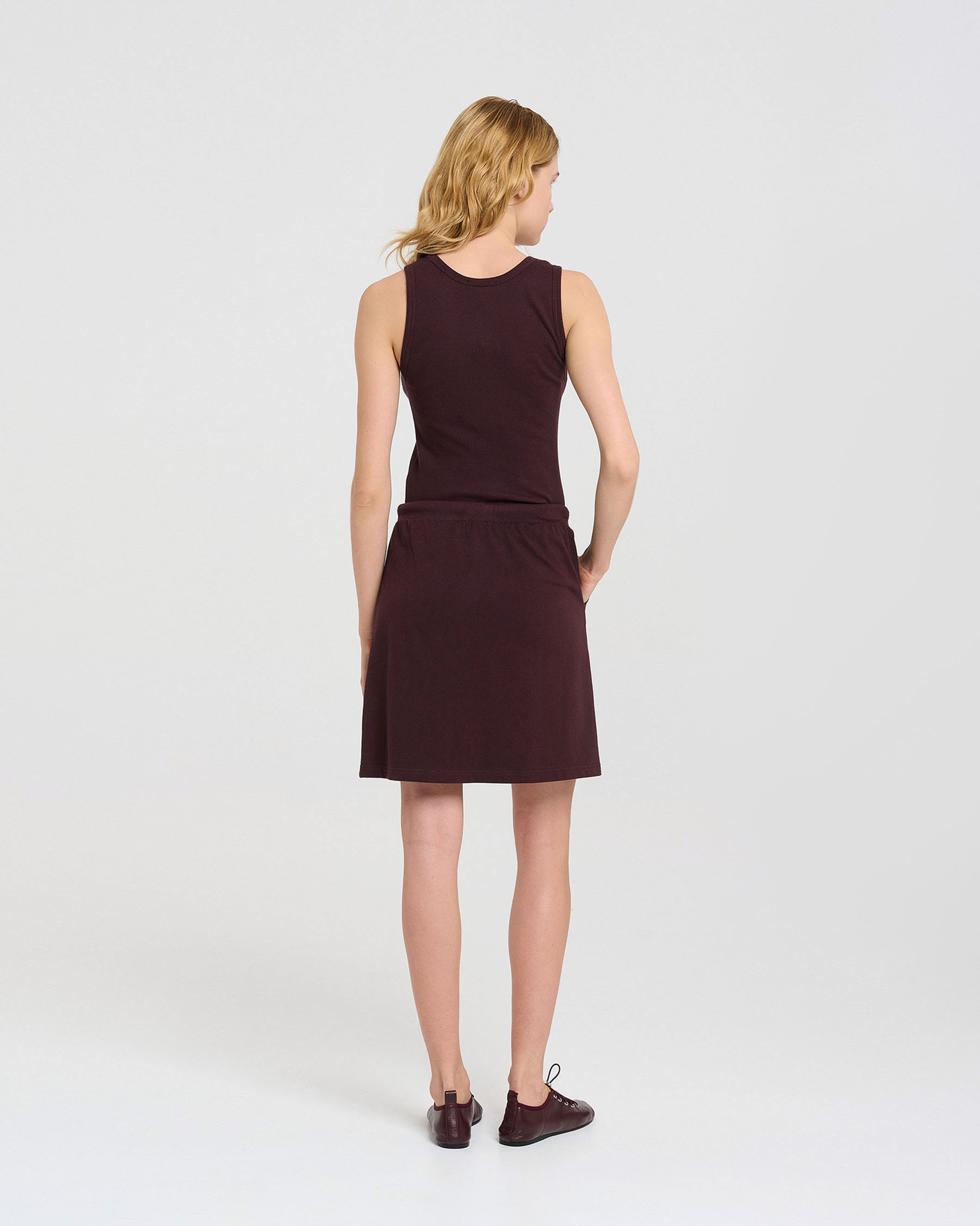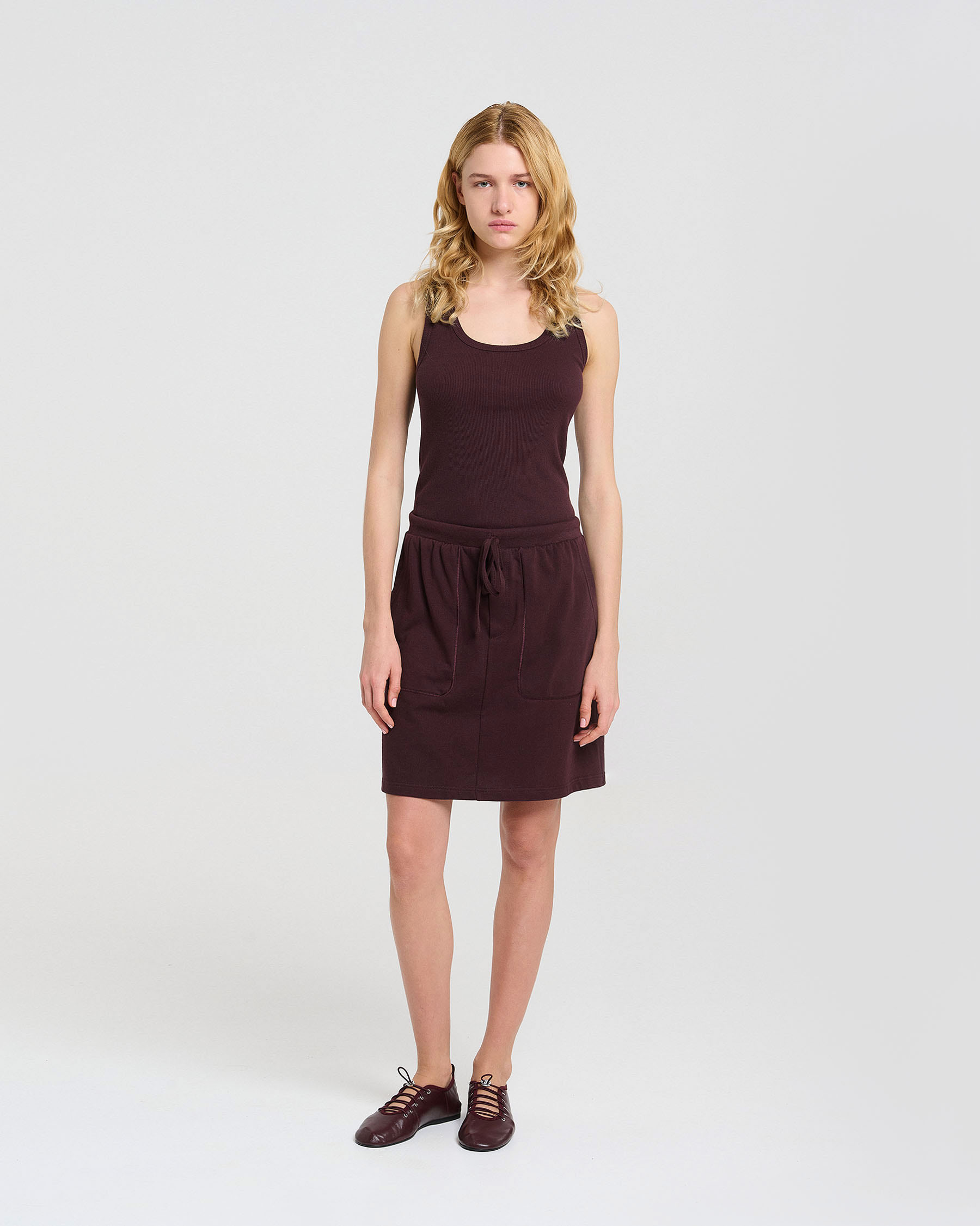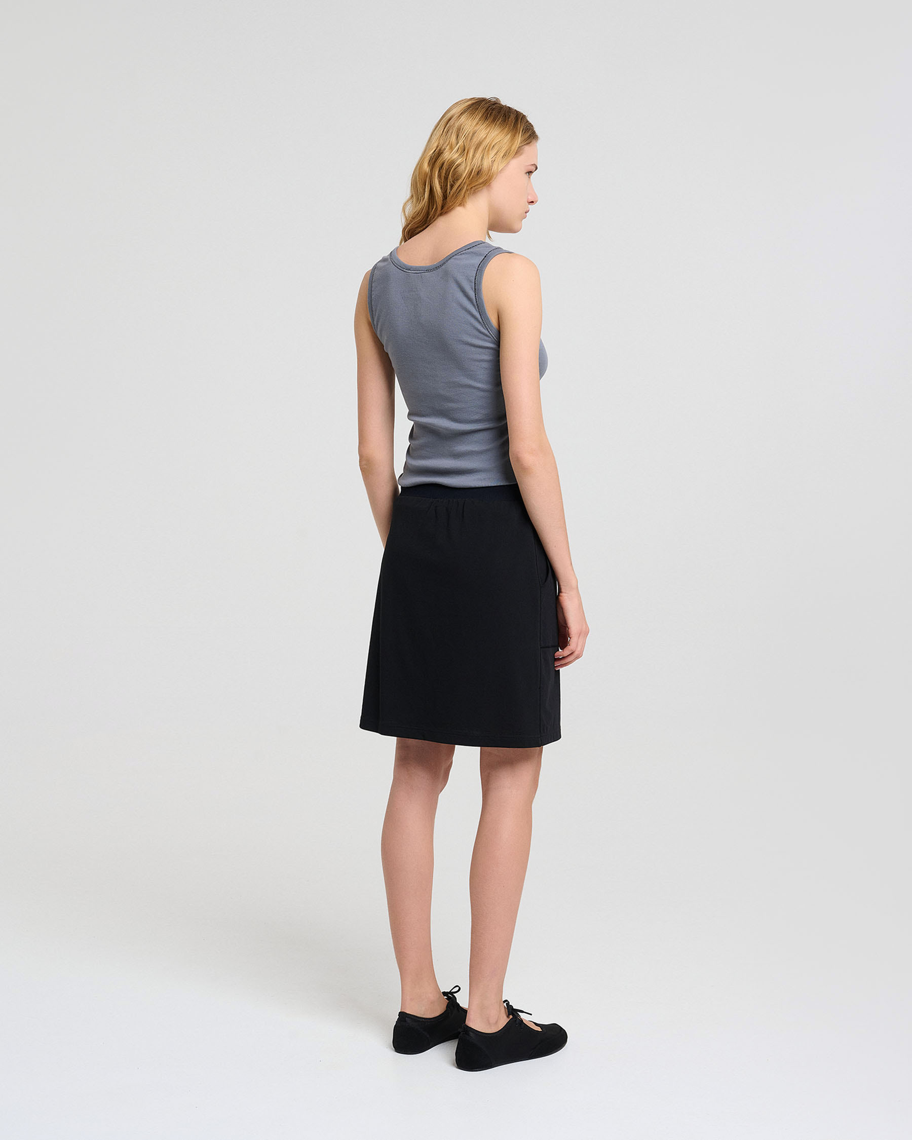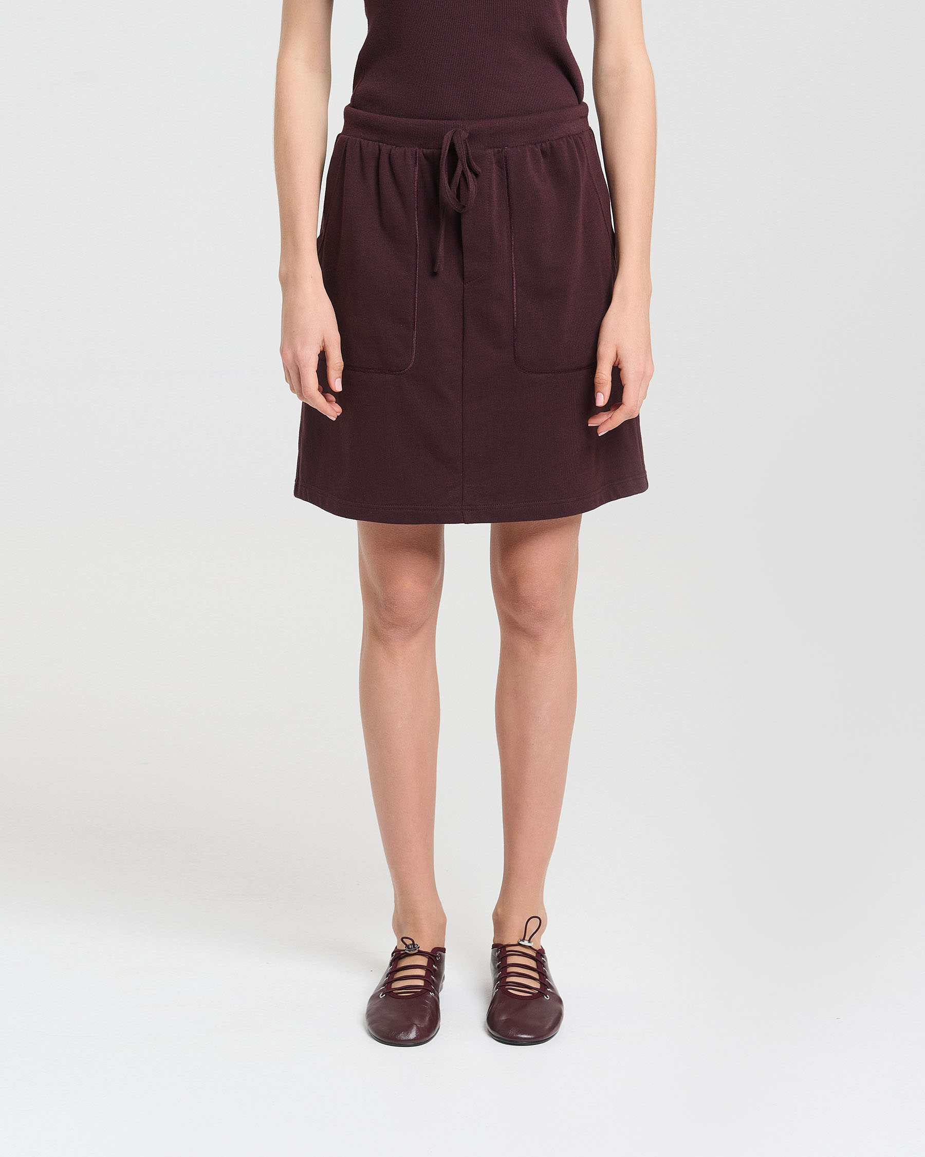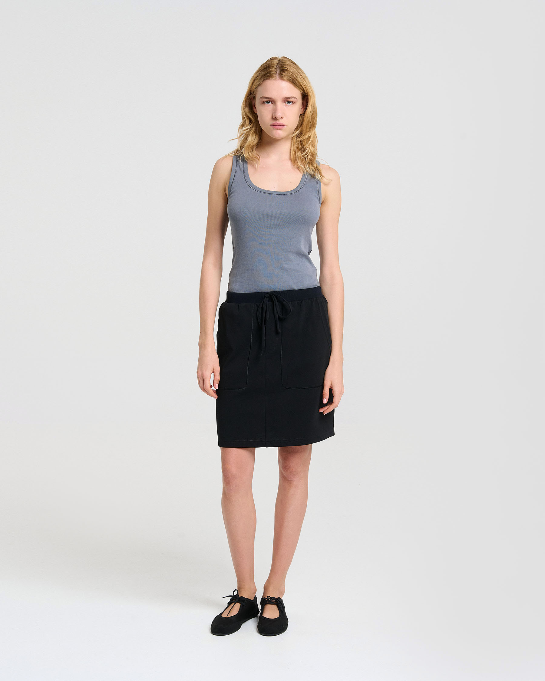 Βαμβακερή κοντή φούστα σε γραμμή Α με κορδόνι και λάστιχο στη μέση και απλικέ τσέπες. Κατασκευάζεται στην Ελλάδα.