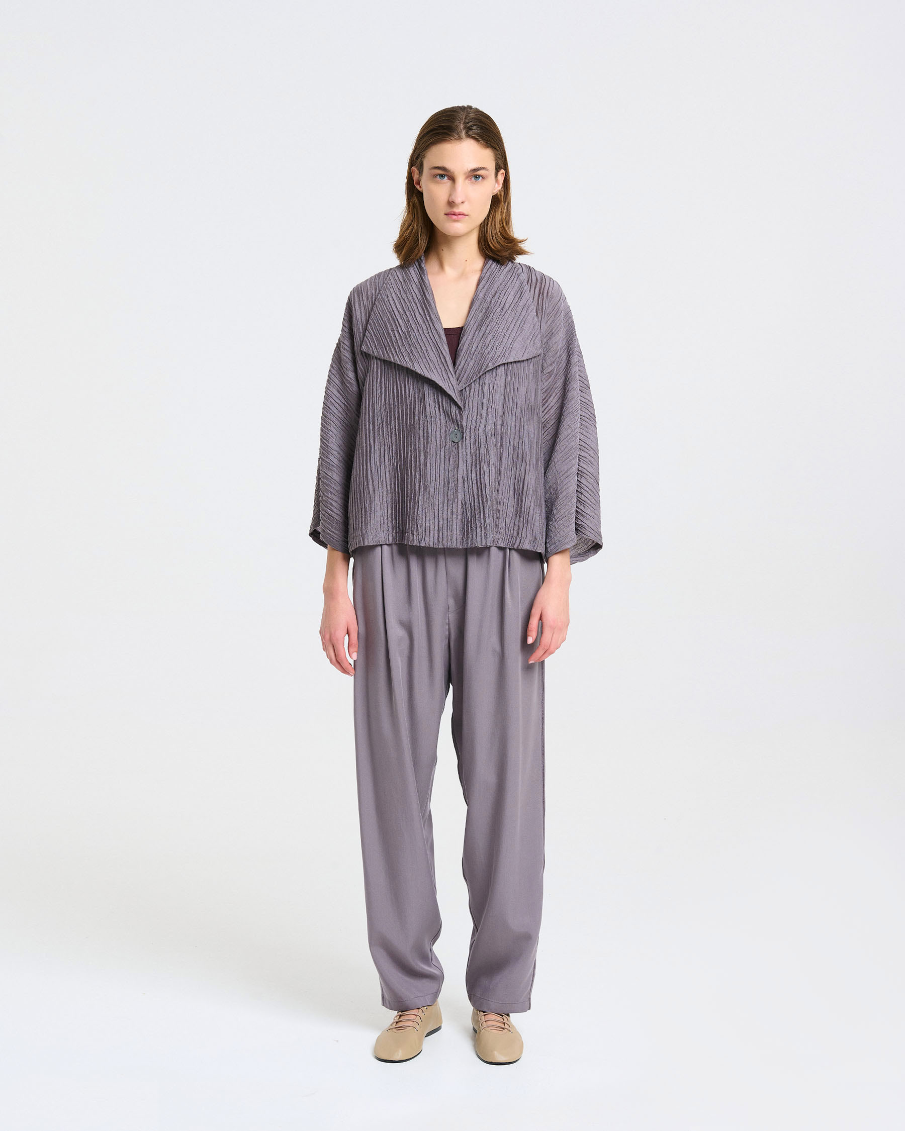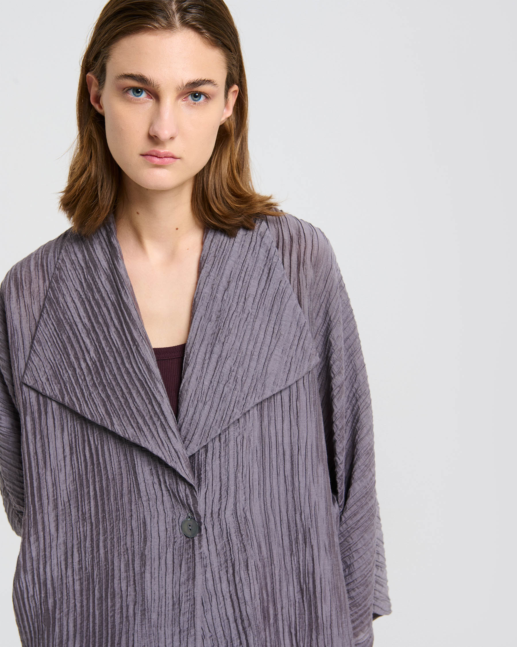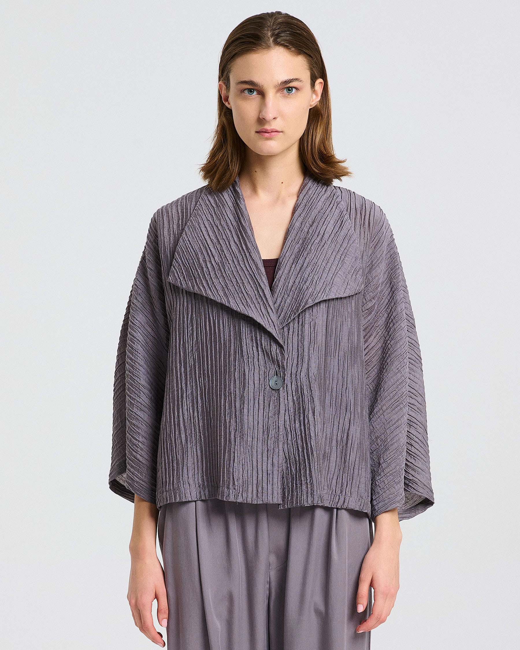 Κοντή φαρδιά ζακέτα με 3/4 μανίκια και πέτα σε τσαλακωτό ύφασμα. Κατασκευάζεται στην Ελλάδα.