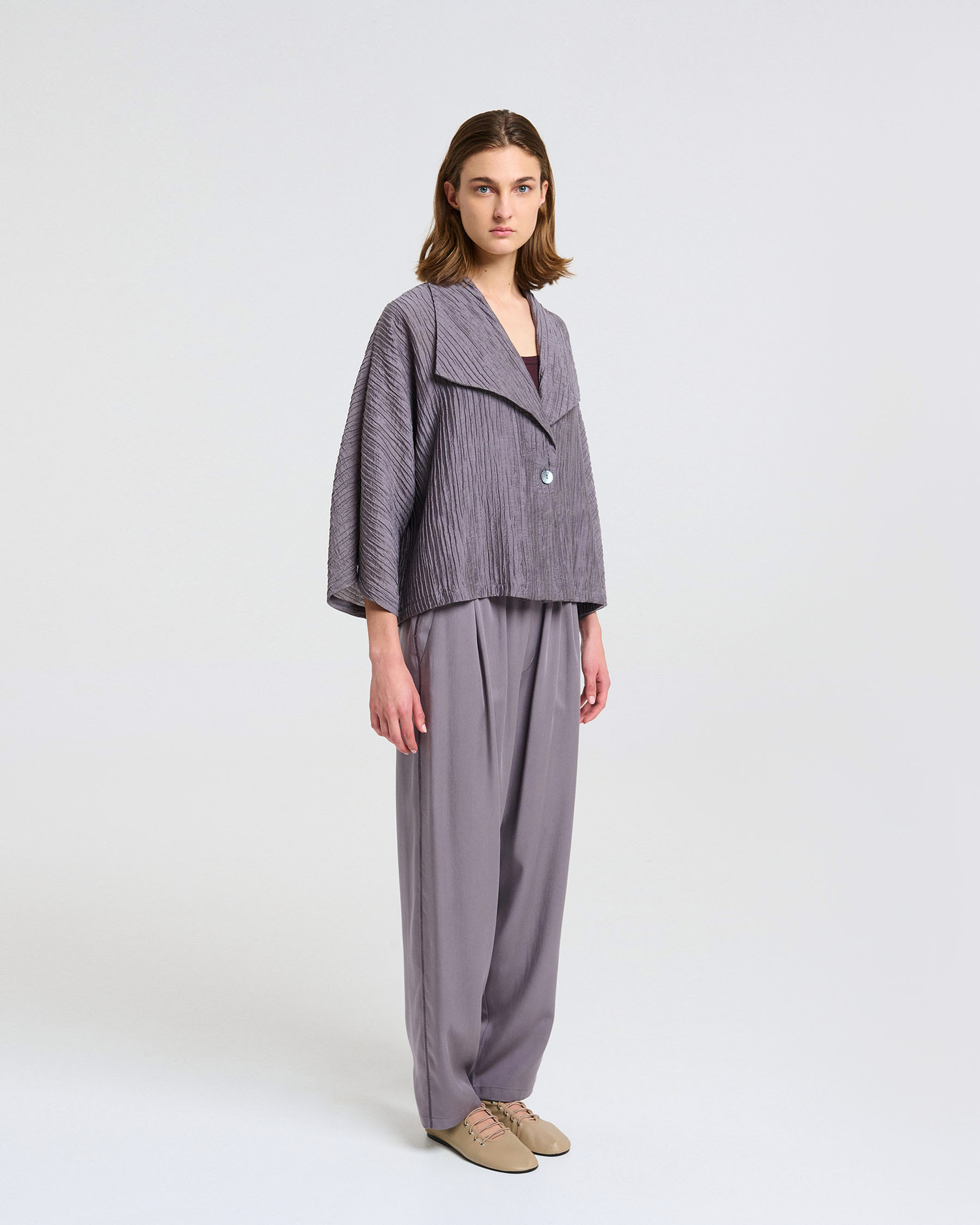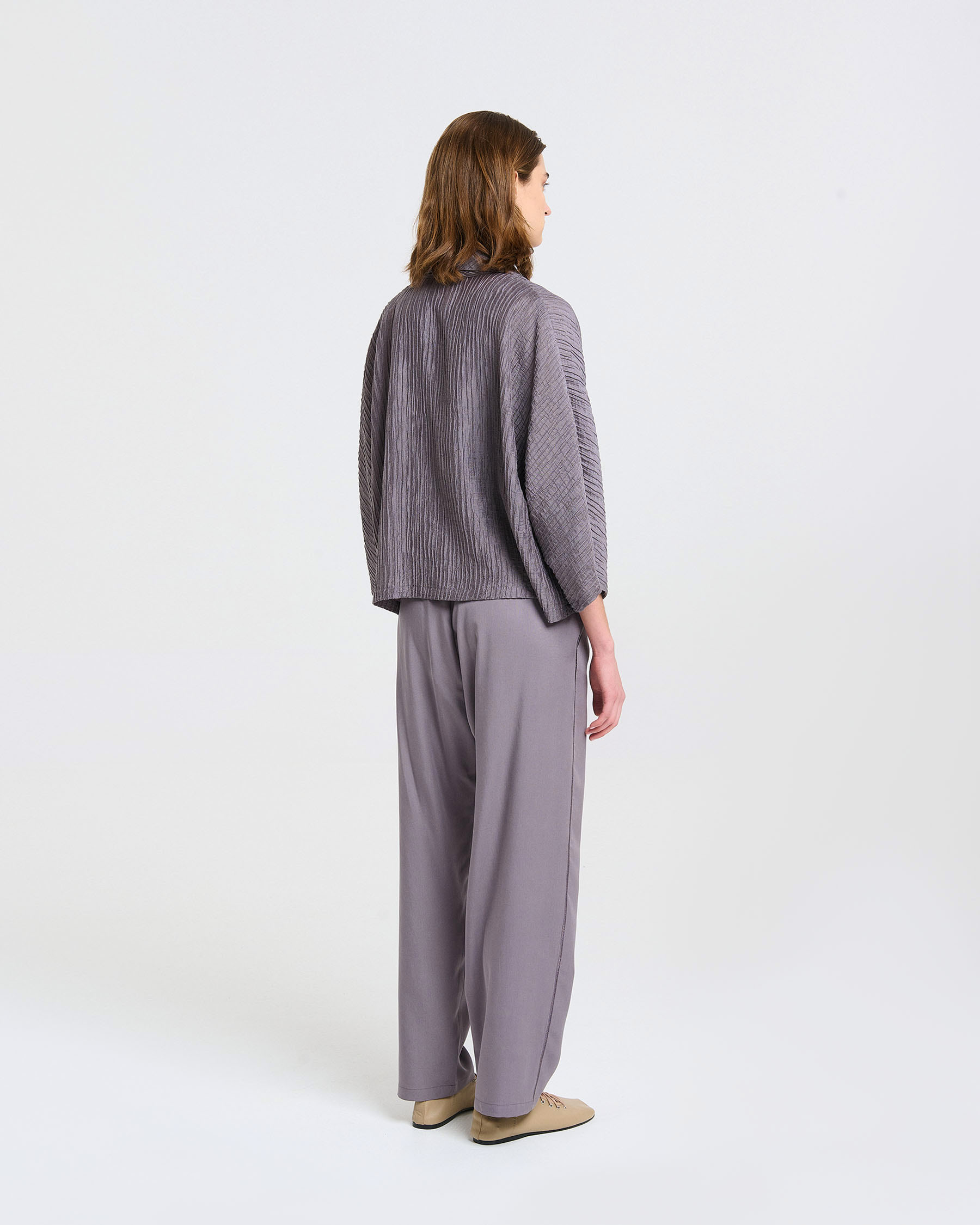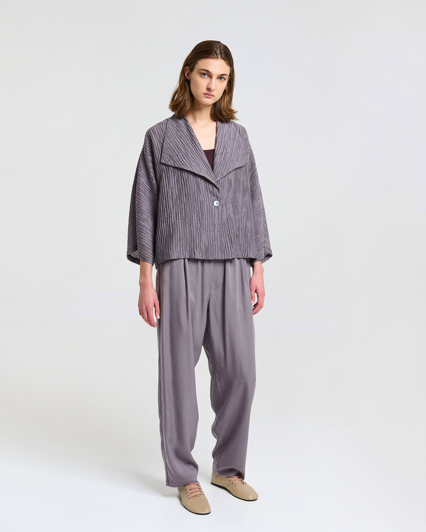 Κοντή φαρδιά ζακέτα με 3/4 μανίκια και πέτα σε τσαλακωτό ύφασμα. Κατασκευάζεται στην Ελλάδα.