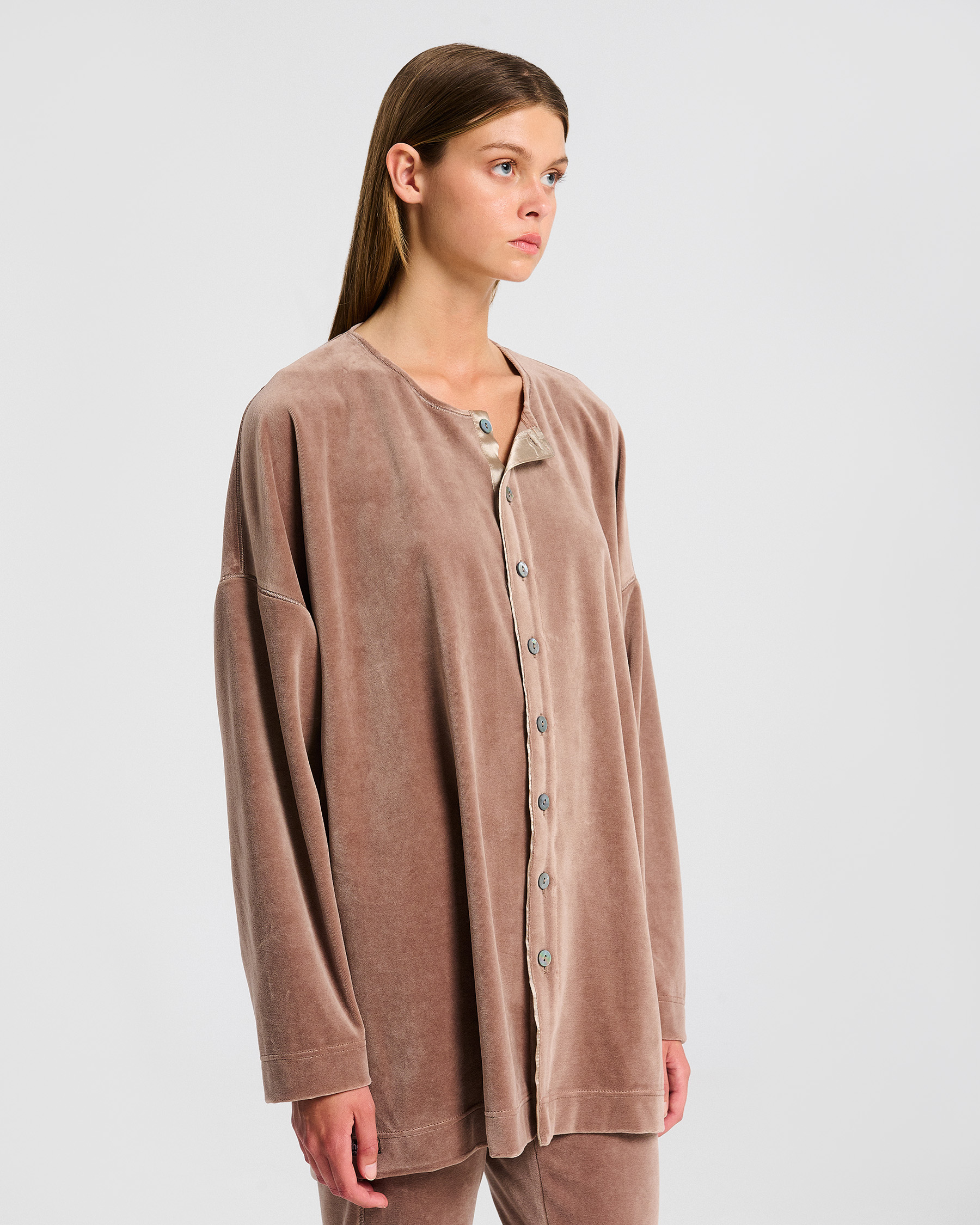 Φαρδιά μακρυμάνικη βελούδινη ζακέτα με σατέν λεπτομέρεια, φίλντισι κουμπιά και διακοσμητικές ομοιόχρωμες ραφές. Η ετικέτα Parthenis Athens-Mykonos είναι ραμμένη εξωτερικά, στην δεξιά πλευρά του στριφώματος. Κατασκευάζεται στην Ελλάδα.