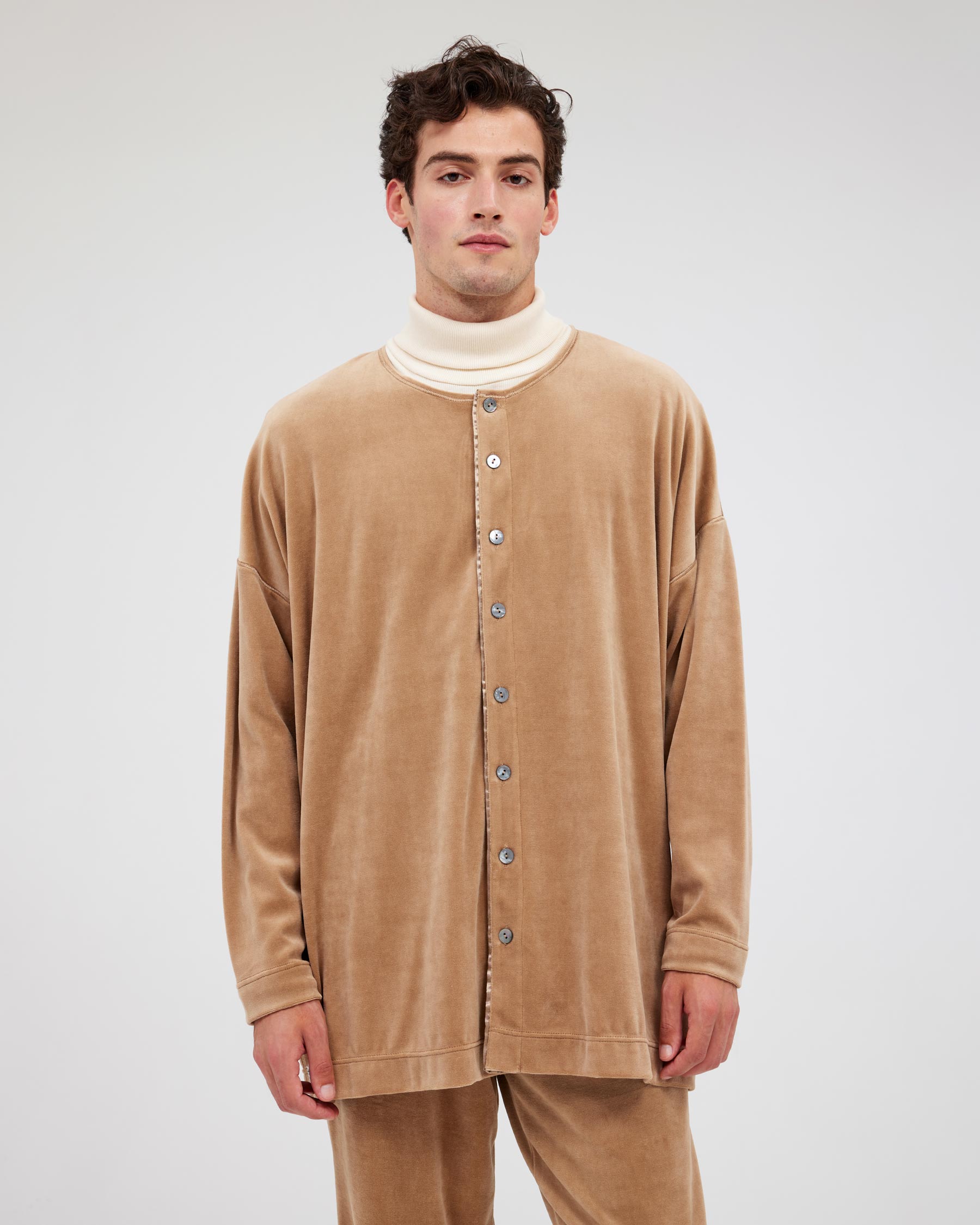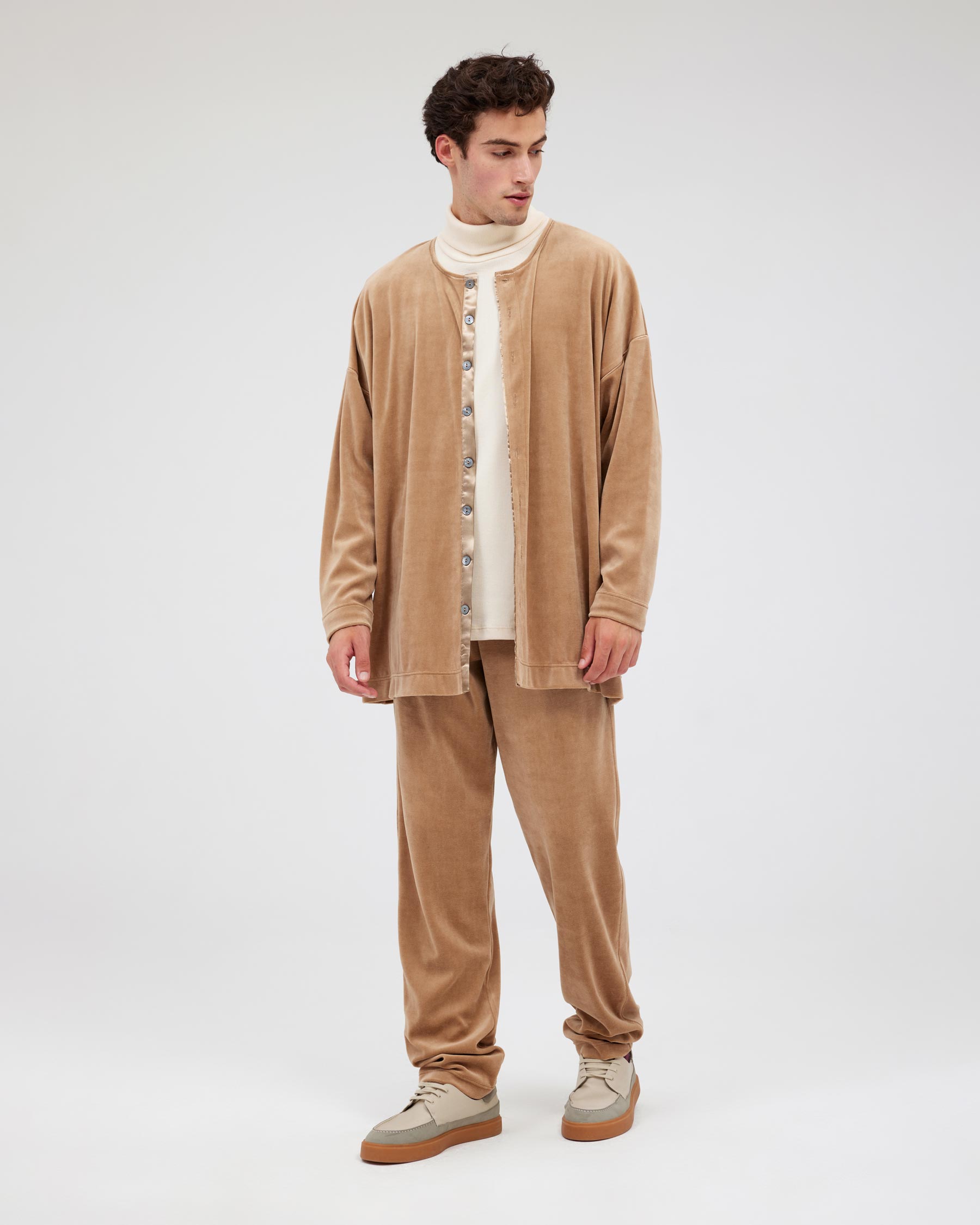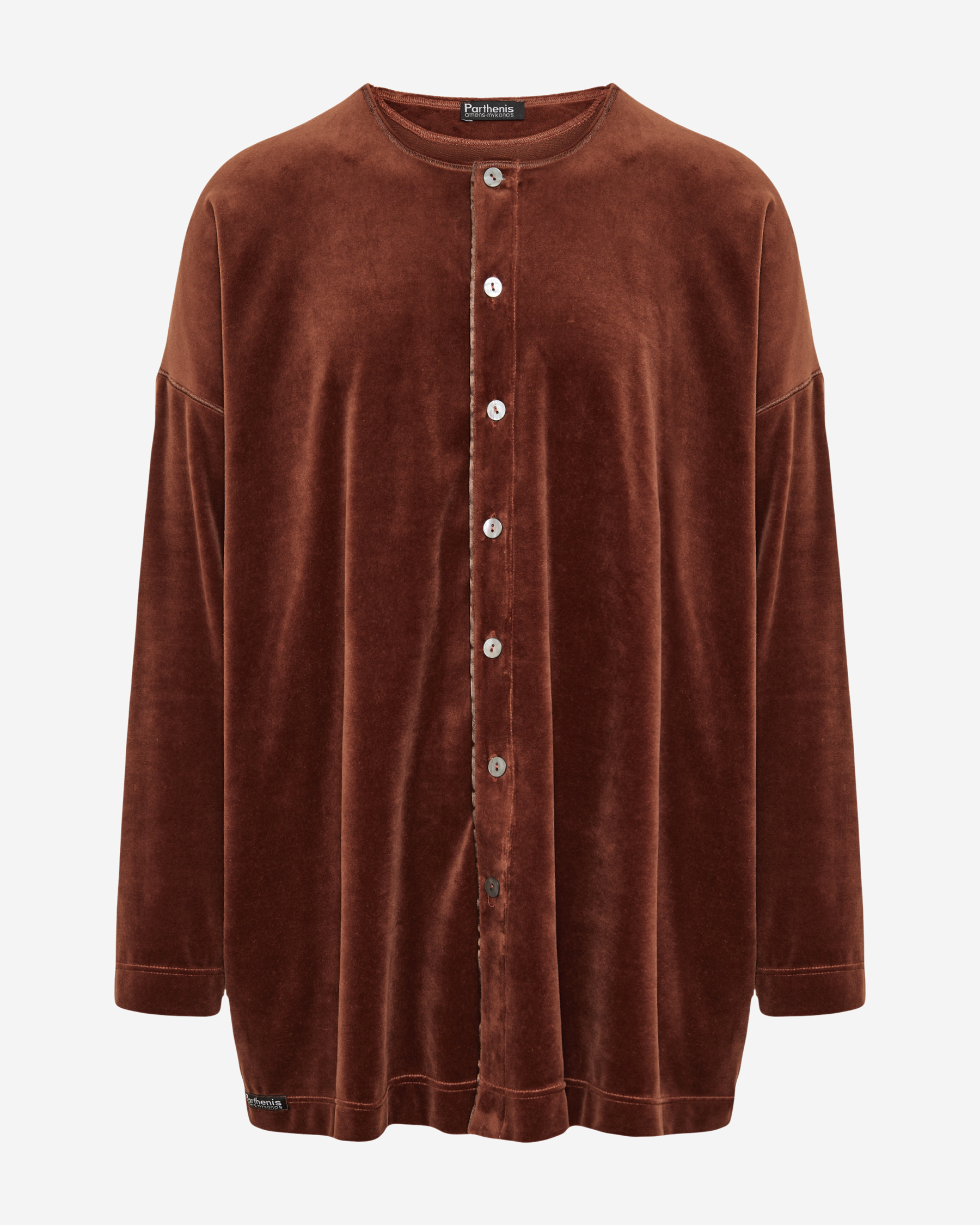 Φαρδιά μακρυμάνικη βελούδινη ζακέτα με σατέν λεπτομέρεια, φίλντισι κουμπιά και διακοσμητικές ομοιόχρωμες ραφές. Η ετικέτα Parthenis Athens-Mykonos είναι ραμμένη εξωτερικά, στην δεξιά πλευρά του στριφώματος. Κατασκευάζεται στην Ελλάδα.