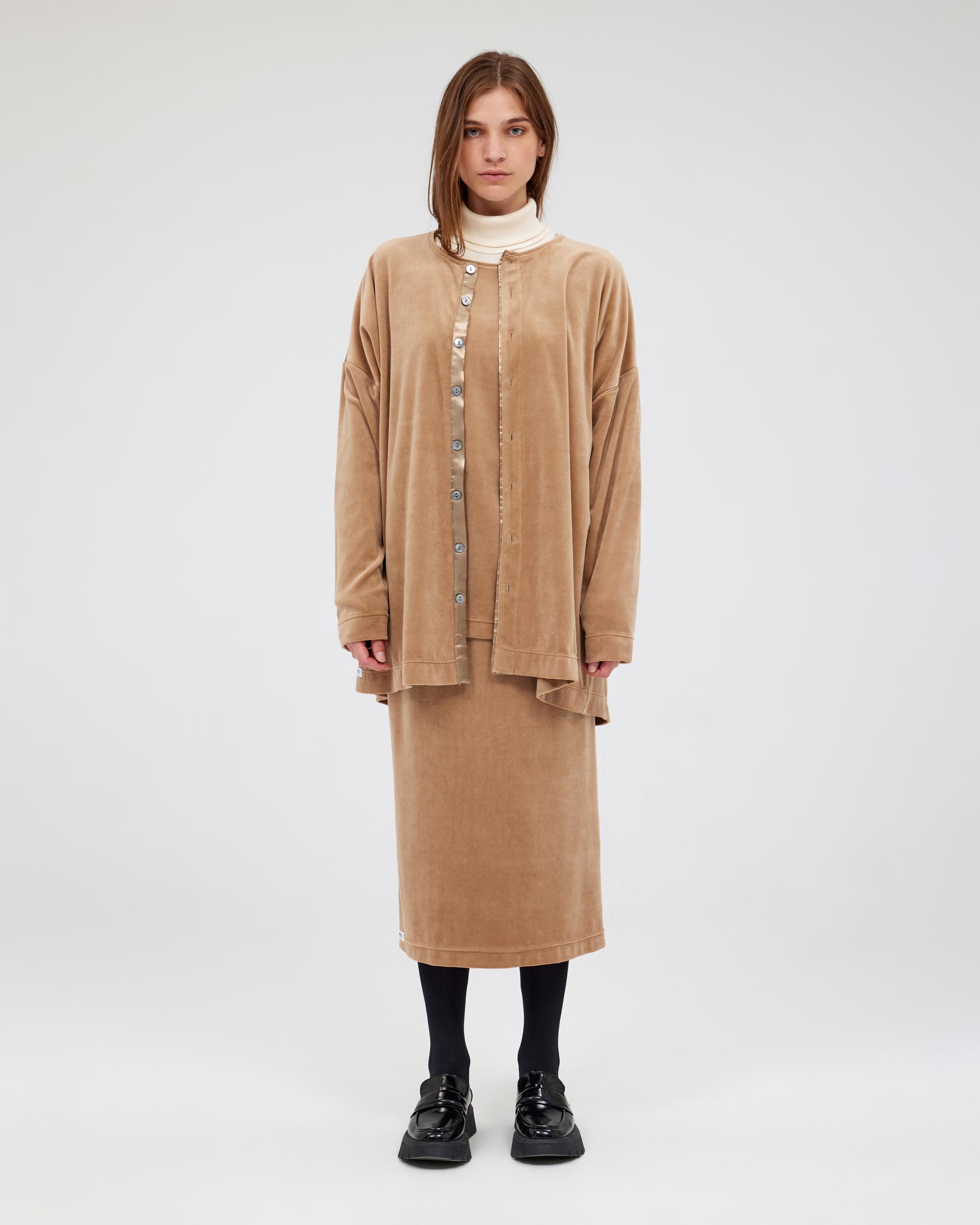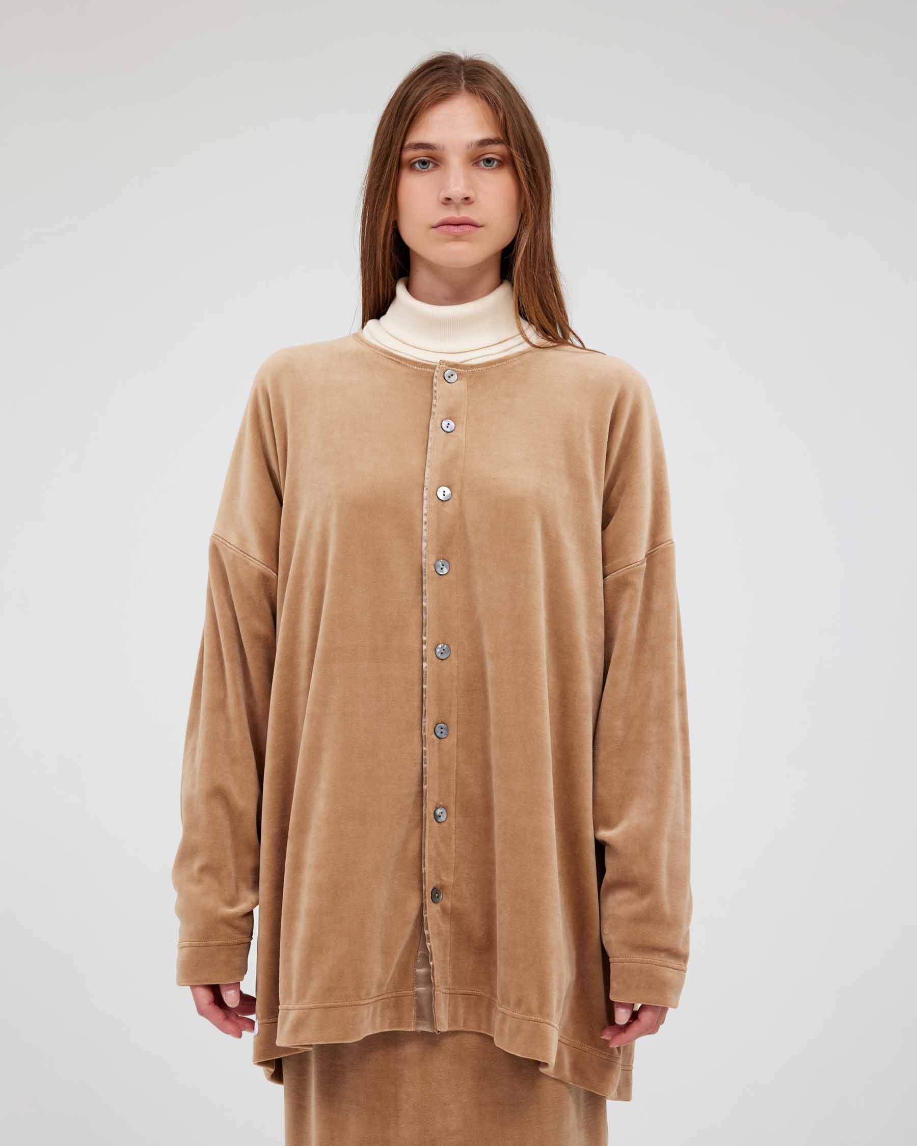 Φαρδιά μακρυμάνικη βελούδινη ζακέτα με σατέν λεπτομέρεια, φίλντισι κουμπιά και διακοσμητικές ομοιόχρωμες ραφές. Η ετικέτα Parthenis Athens-Mykonos είναι ραμμένη εξωτερικά, στην δεξιά πλευρά του στριφώματος. Κατασκευάζεται στην Ελλάδα.