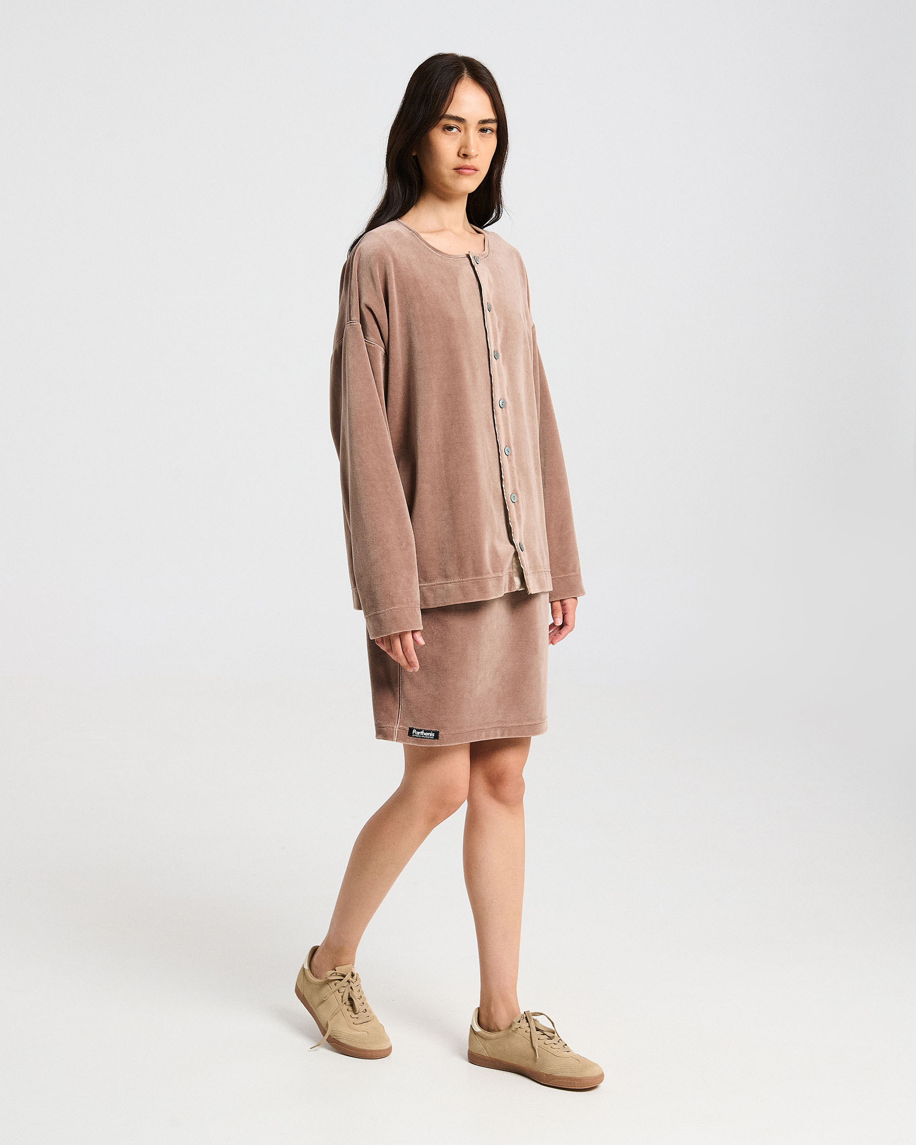 Μακρυμάνικη βελούδινη ζακέτα με σατέν λεπτομέρεια, φίλντισι κουμπιά και διακοσμητικές ομοιόχρωμες ραφές. Η ετικέτα Parthenis Athens-Mykonos είναι ραμμένη εξωτερικά, στην δεξιά πλευρά του στριφώματος. Κατασκευάζεται στην Ελλάδα.