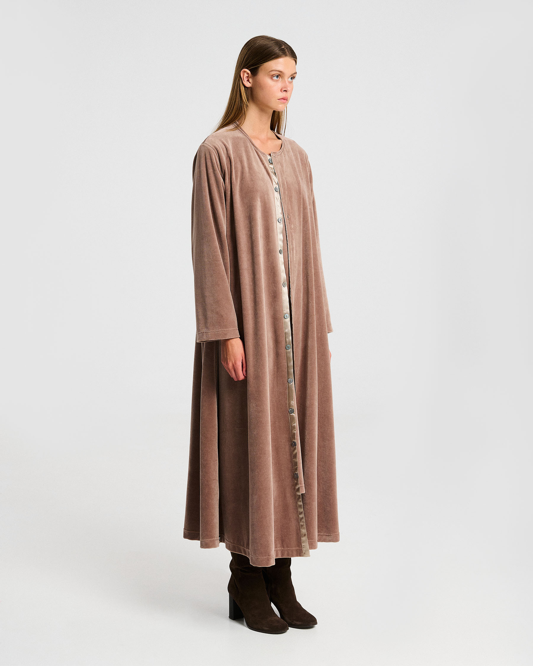Μακρυμάνικο πολύ φαρδύ μακρύ βελούδινο μαντό σε γραμμή Α με σατέν πατιλέτα και κουμπιά. Κατασκευάζεται στην Ελλάδα.