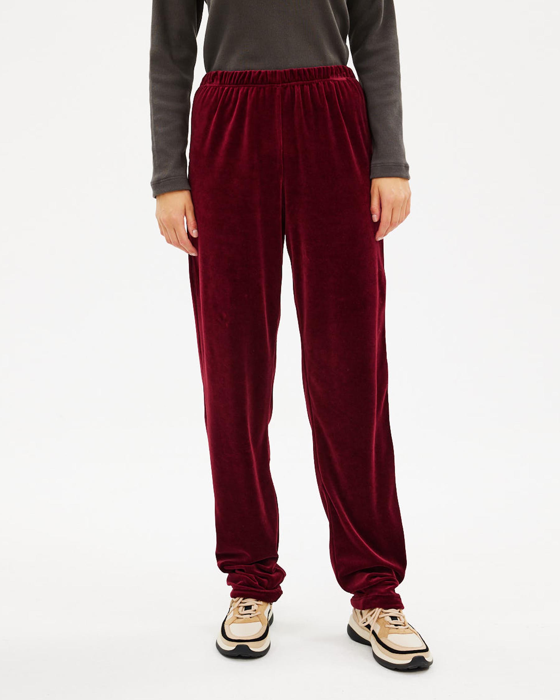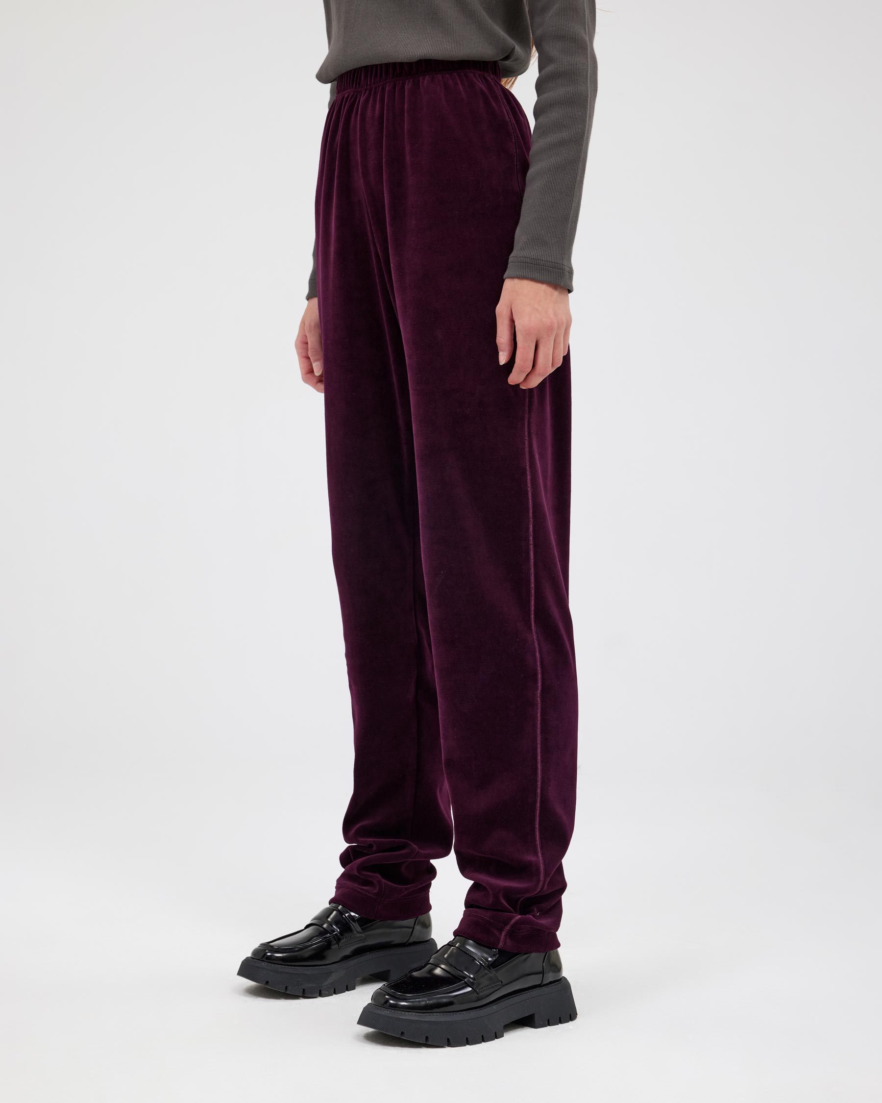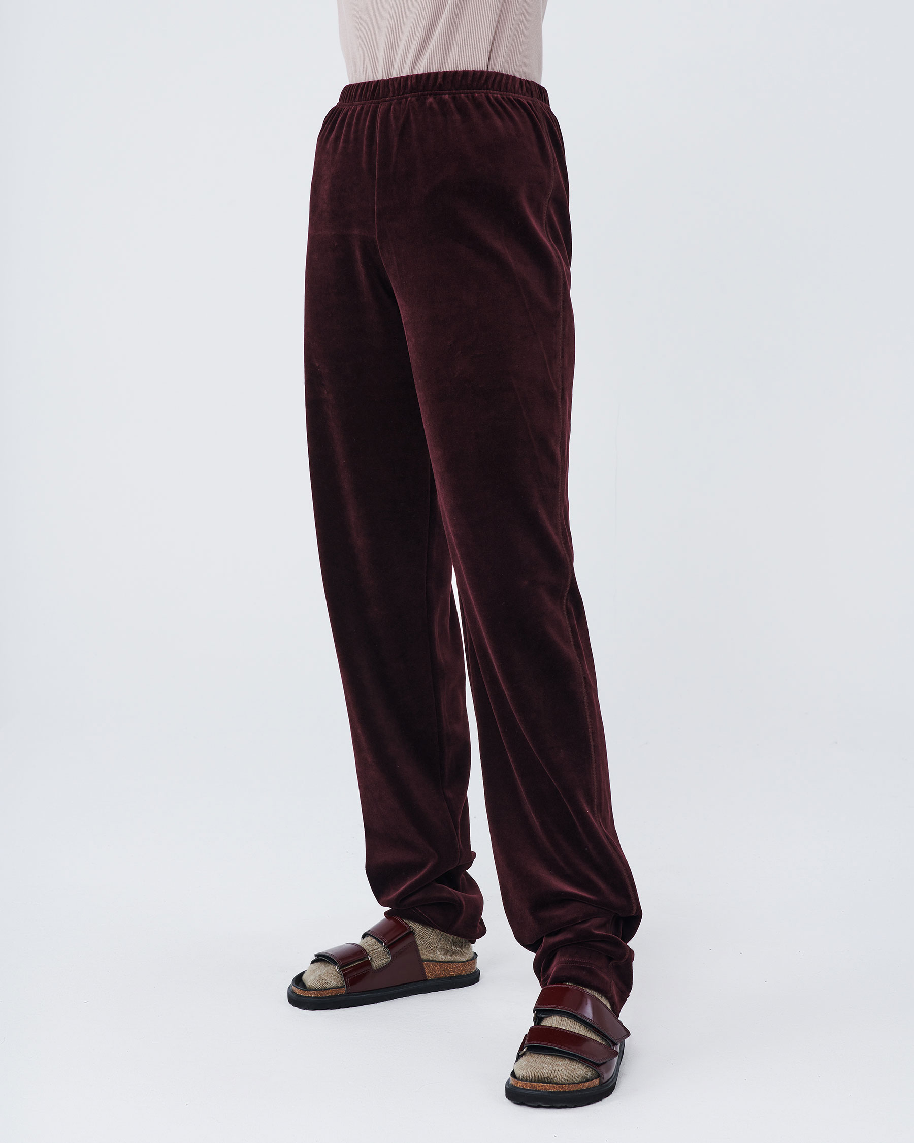 Βελούδινο φαρδύ ψηλοκάβαλο παντελόνι με λάστιχο, μπατζάκι που στενεύει κάτω και διακοσμητικές ομοιόχρωμες ραφές. Η ετικέτα Parthenis Athens-Mykonos είναι ραμμένη εξωτερικά, στην δεξιά πλευρά της πλαϊνής ραφής. Κατασκευάζεται στην Ελλάδα.