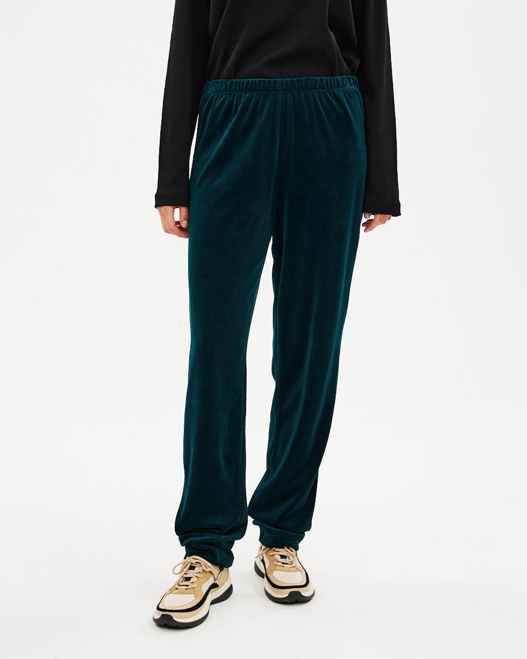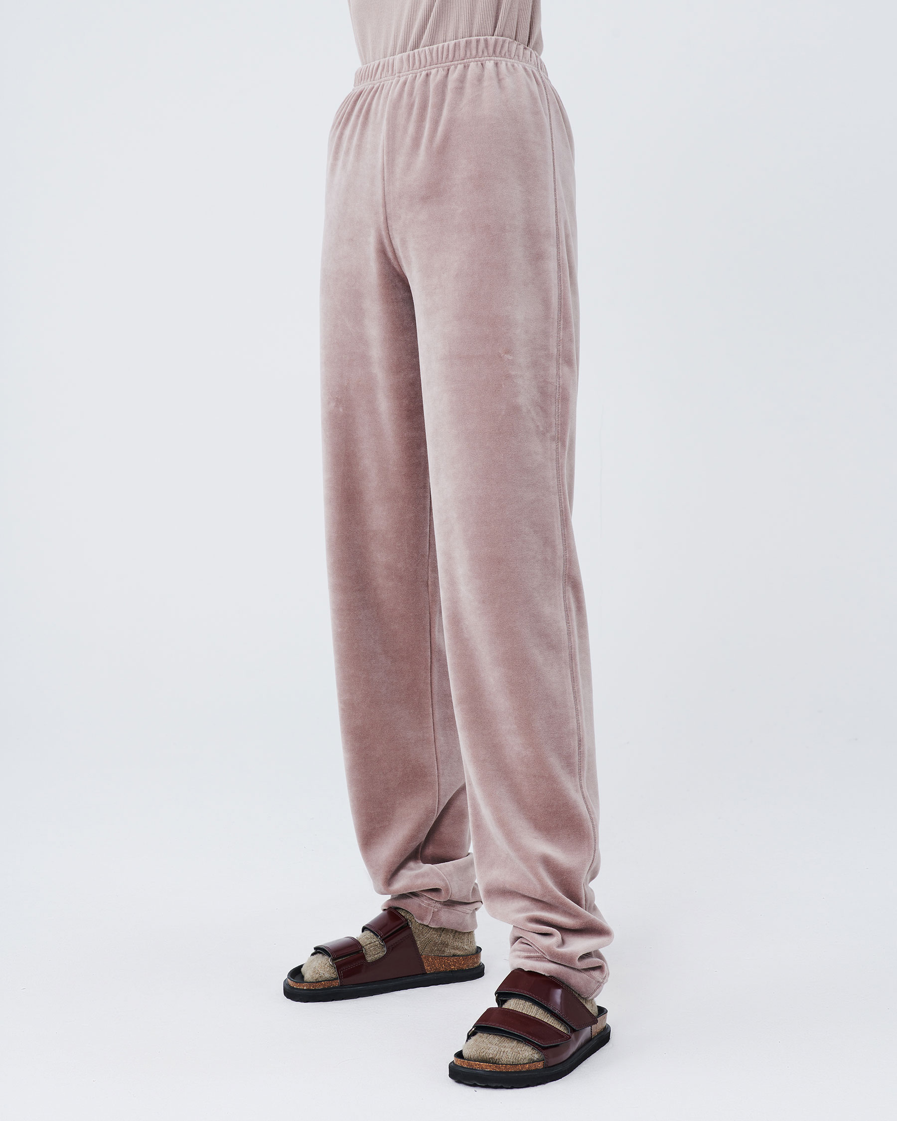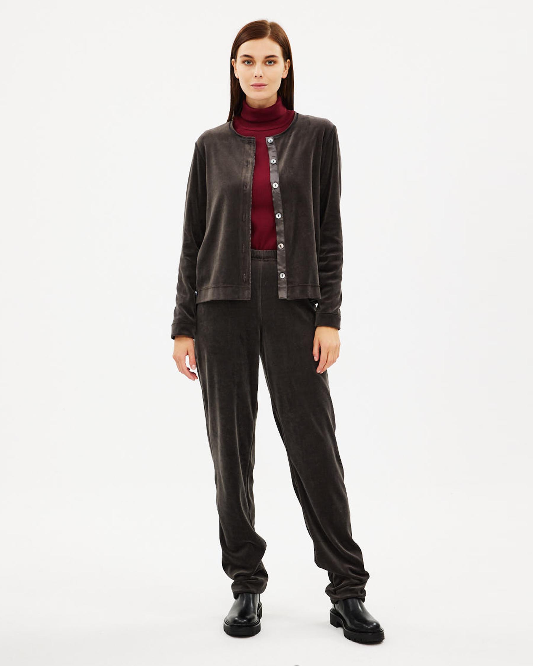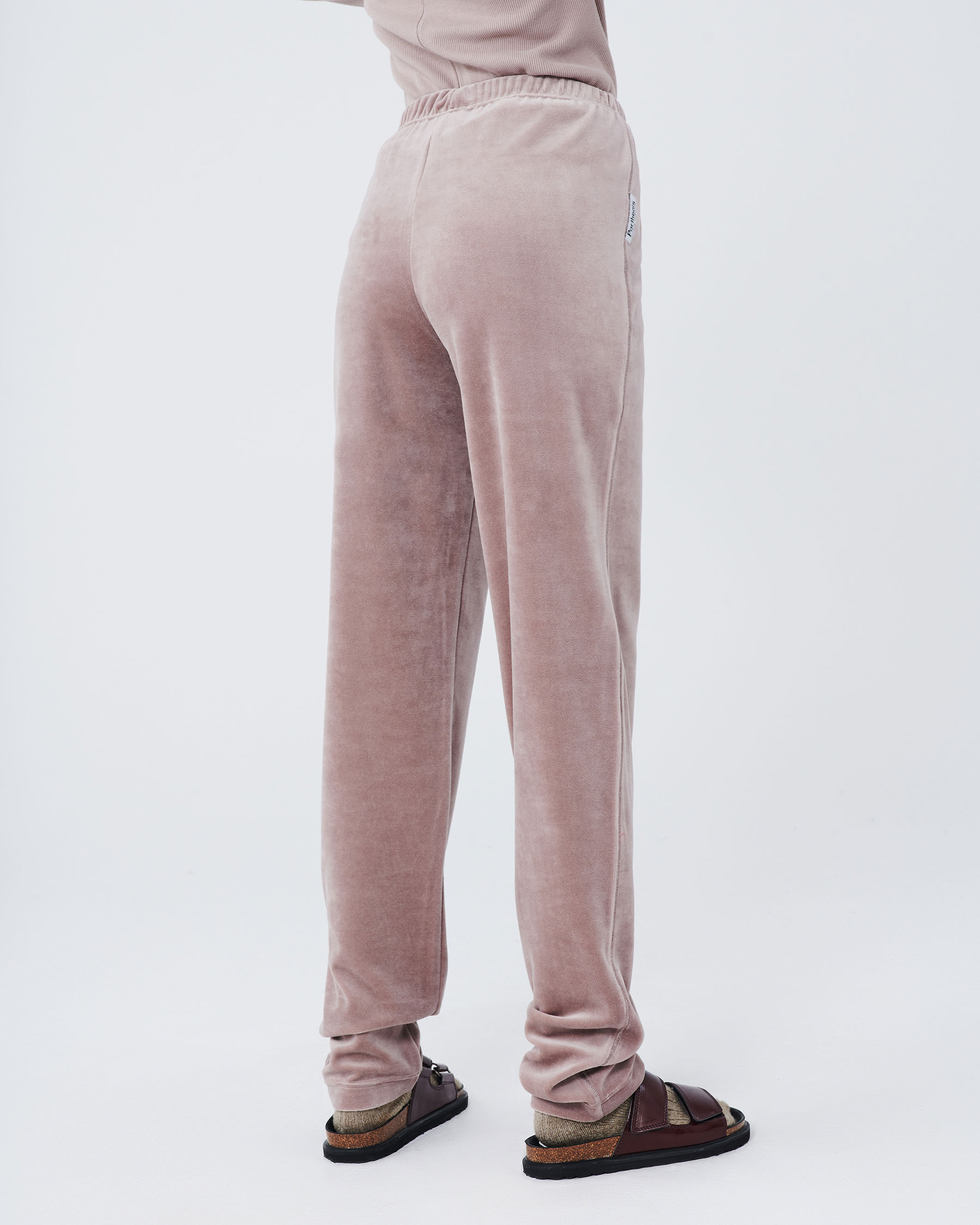 Βελούδινο φαρδύ ψηλοκάβαλο παντελόνι με λάστιχο, μπατζάκι που στενεύει κάτω και διακοσμητικές ομοιόχρωμες ραφές. Η ετικέτα Parthenis Athens-Mykonos είναι ραμμένη εξωτερικά, στην δεξιά πλευρά της πλαϊνής ραφής. Κατασκευάζεται στην Ελλάδα.