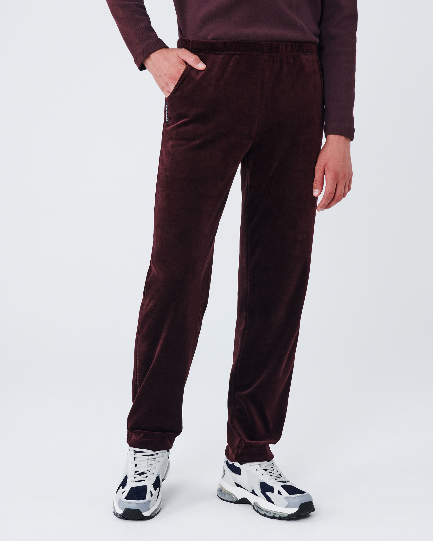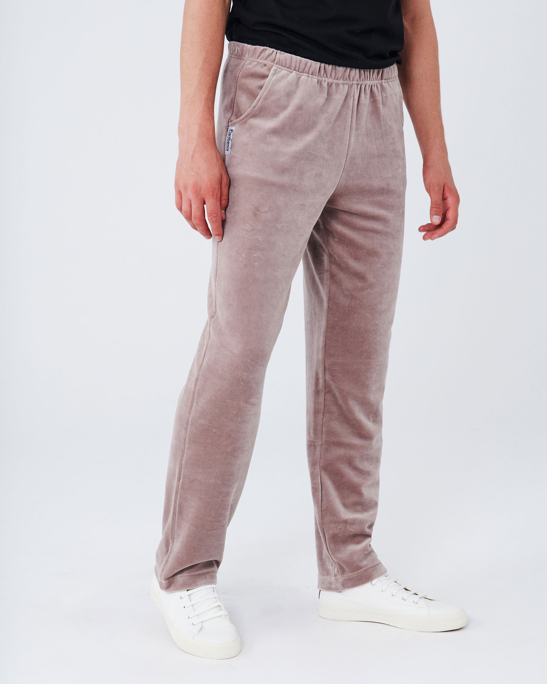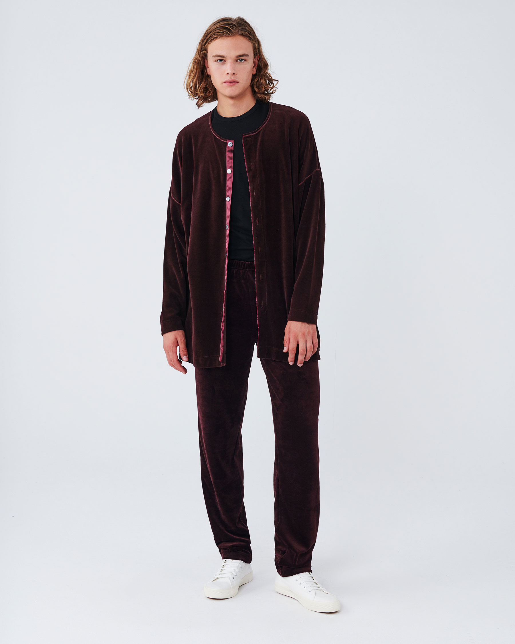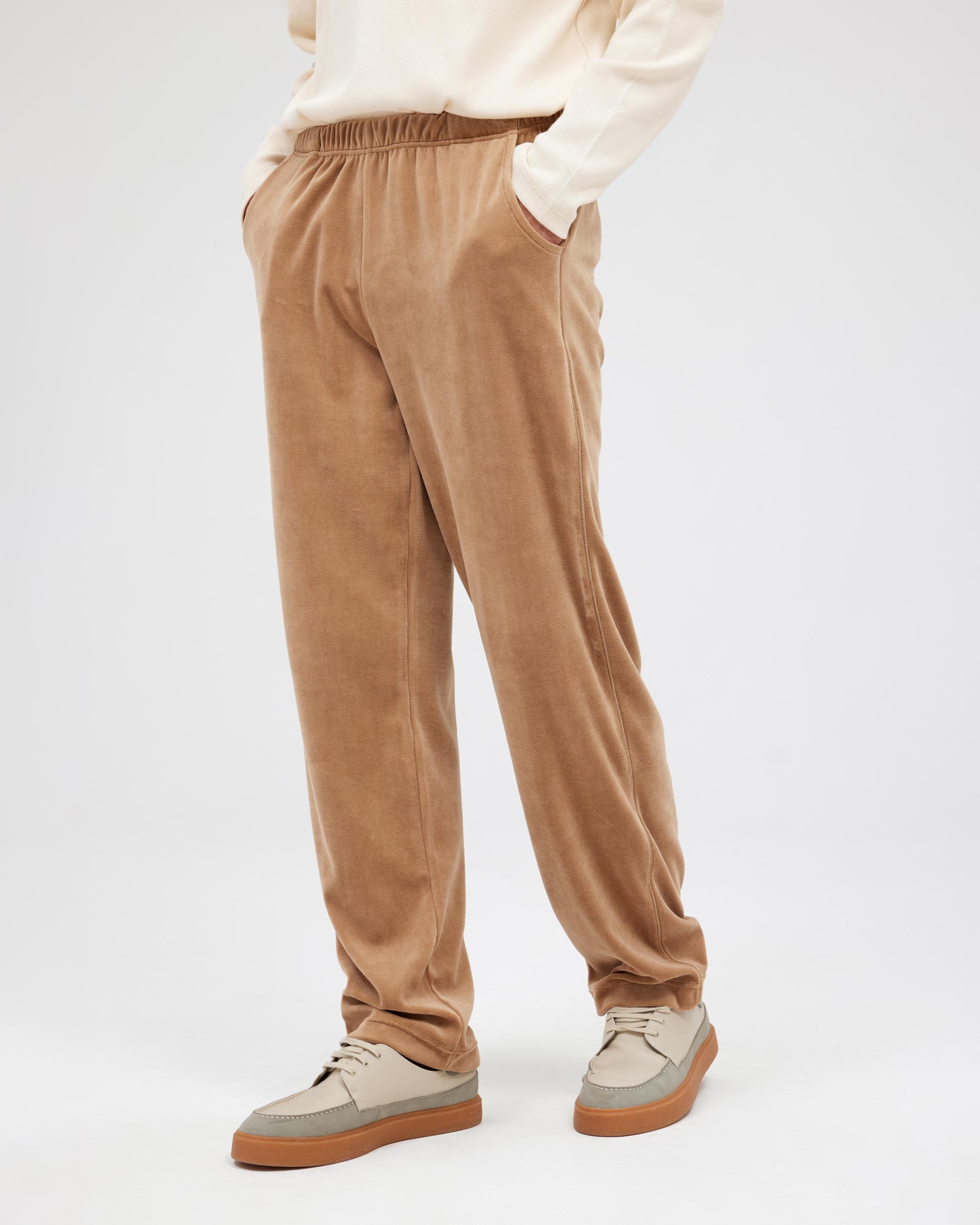Βελούδινο παντελόνι με λάστιχο, μπατζάκι που στενεύει κάτω, τσέπες και διακοσμητικές ομοιόχρωμες ραφές. Η ετικέτα Parthenis Athens-Mykonos είναι ραμμένη εξωτερικά, στην δεξιά πλευρά της πλαϊνής ραφής. Κατασκευάζεται στην Ελλάδα.