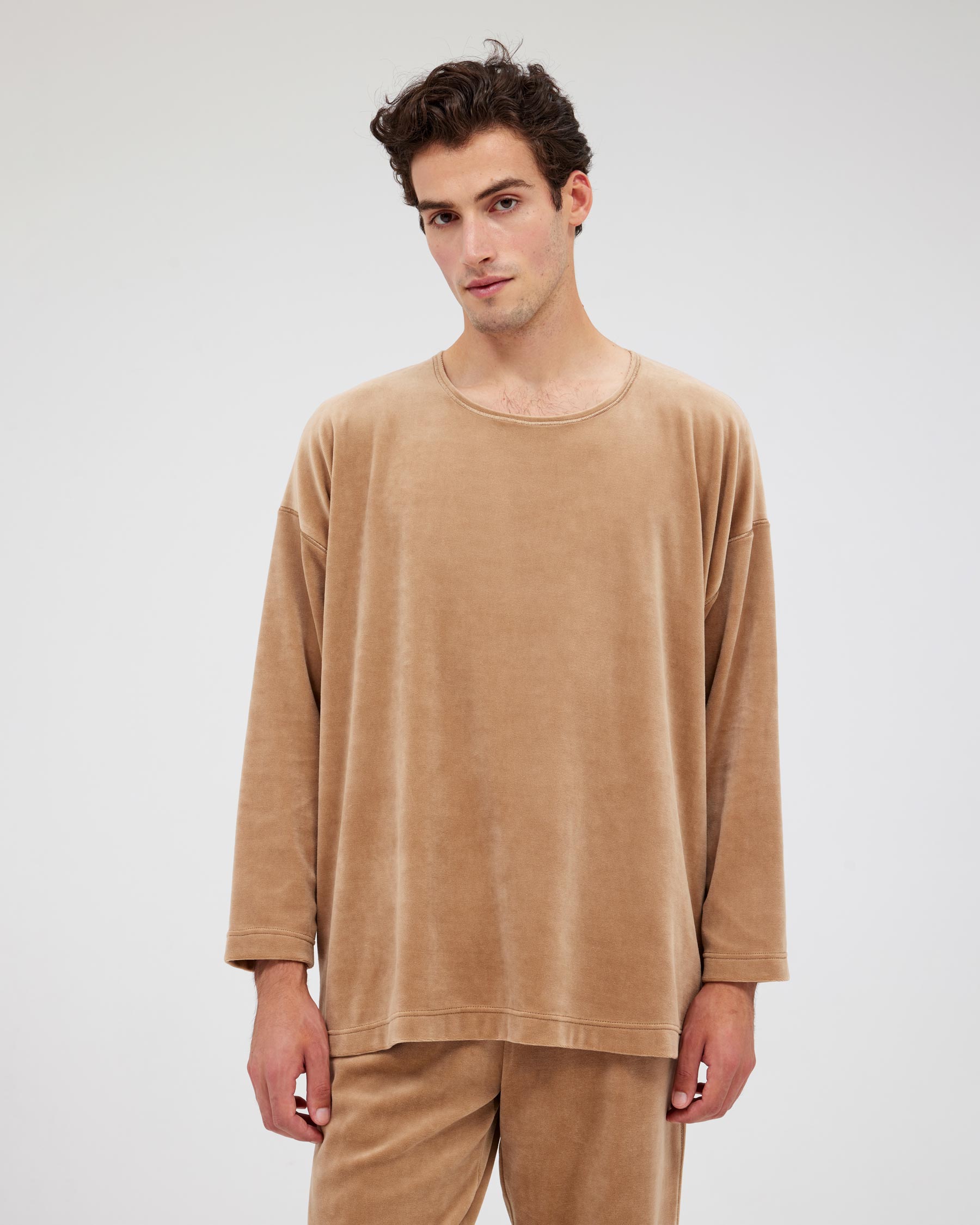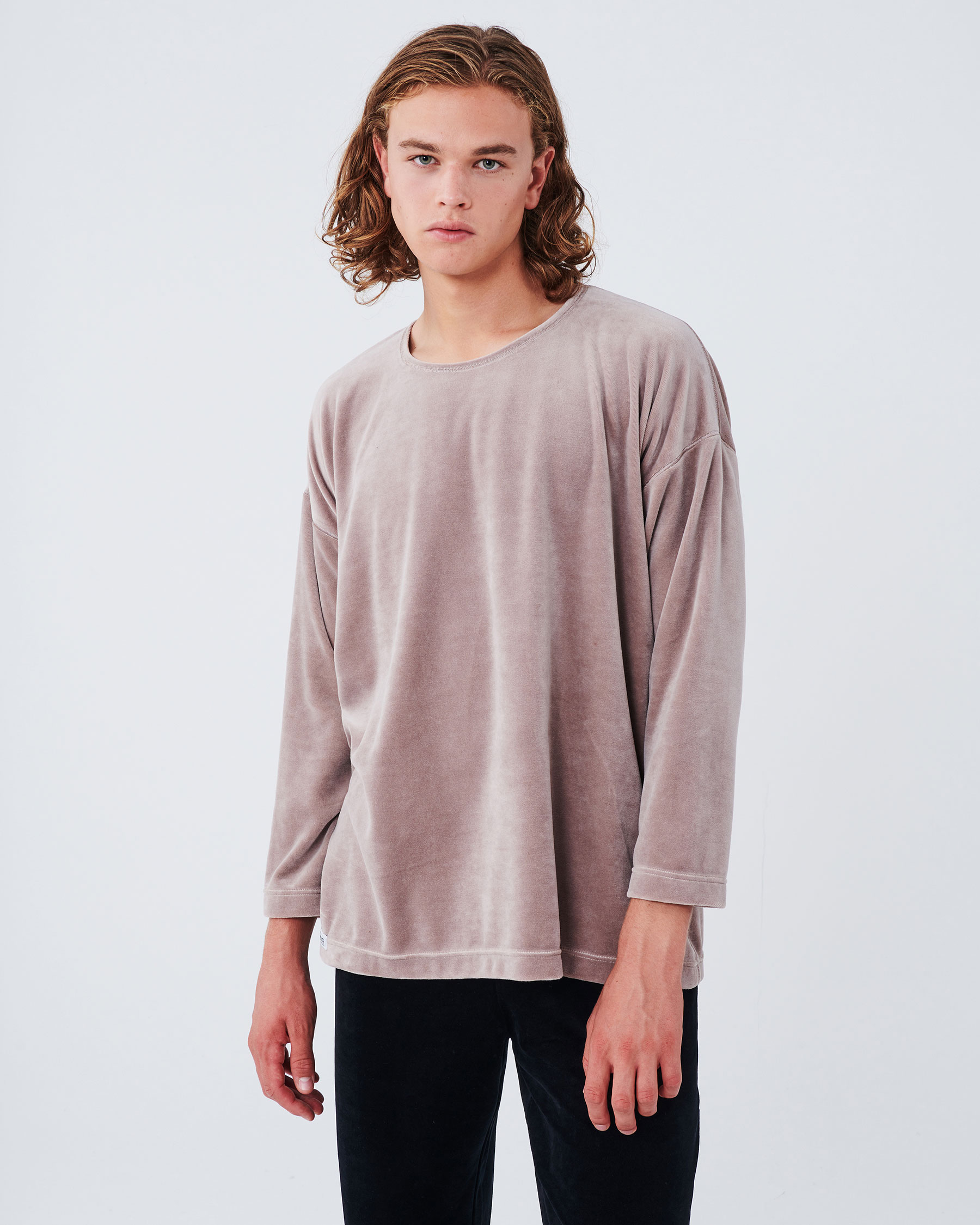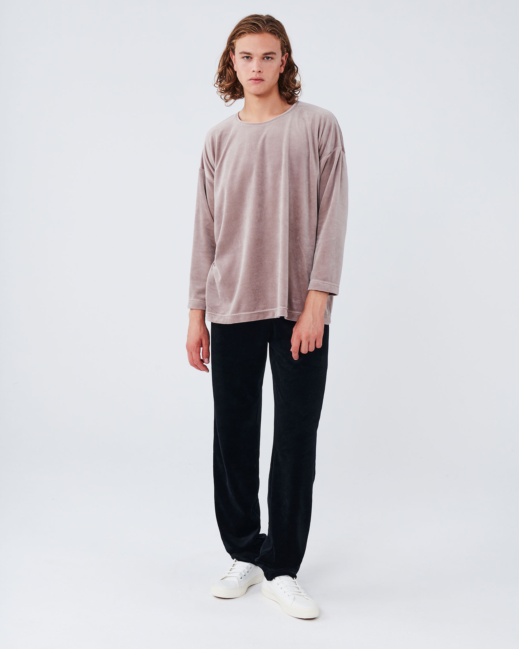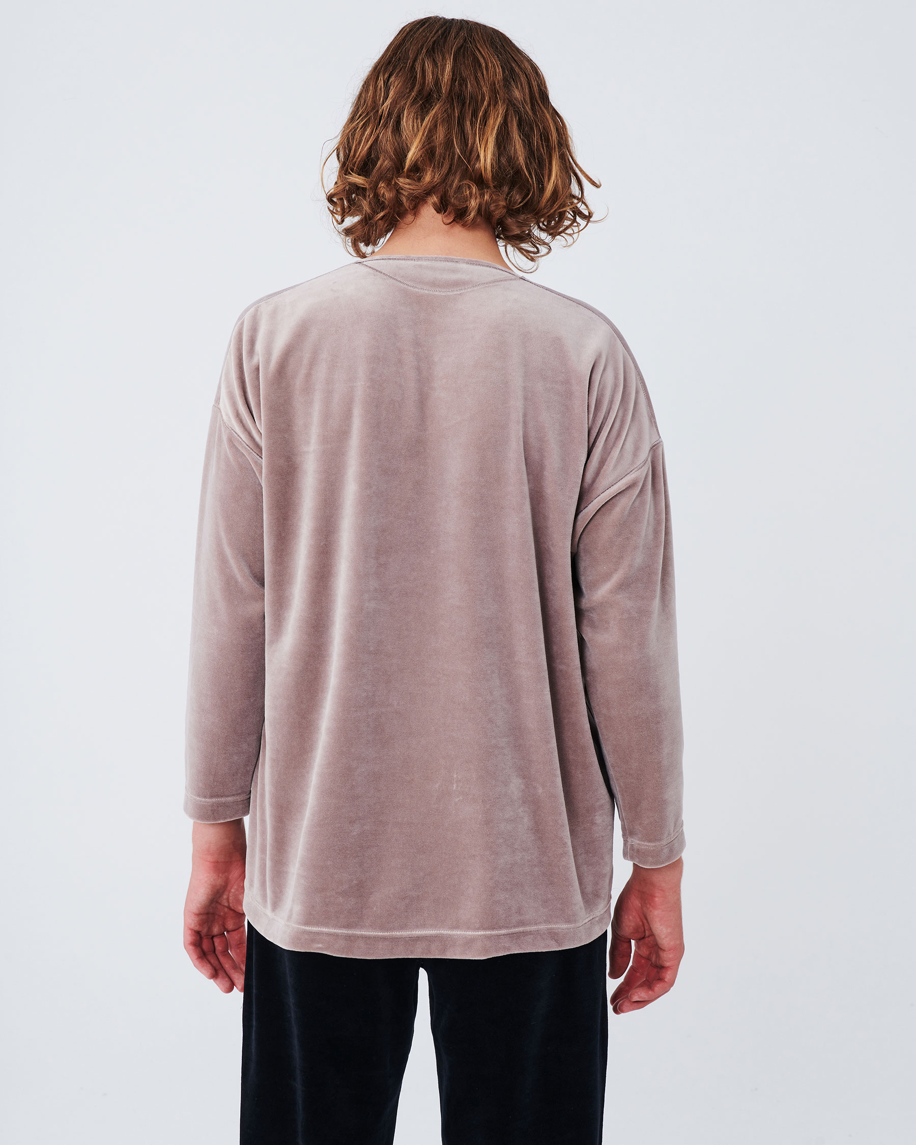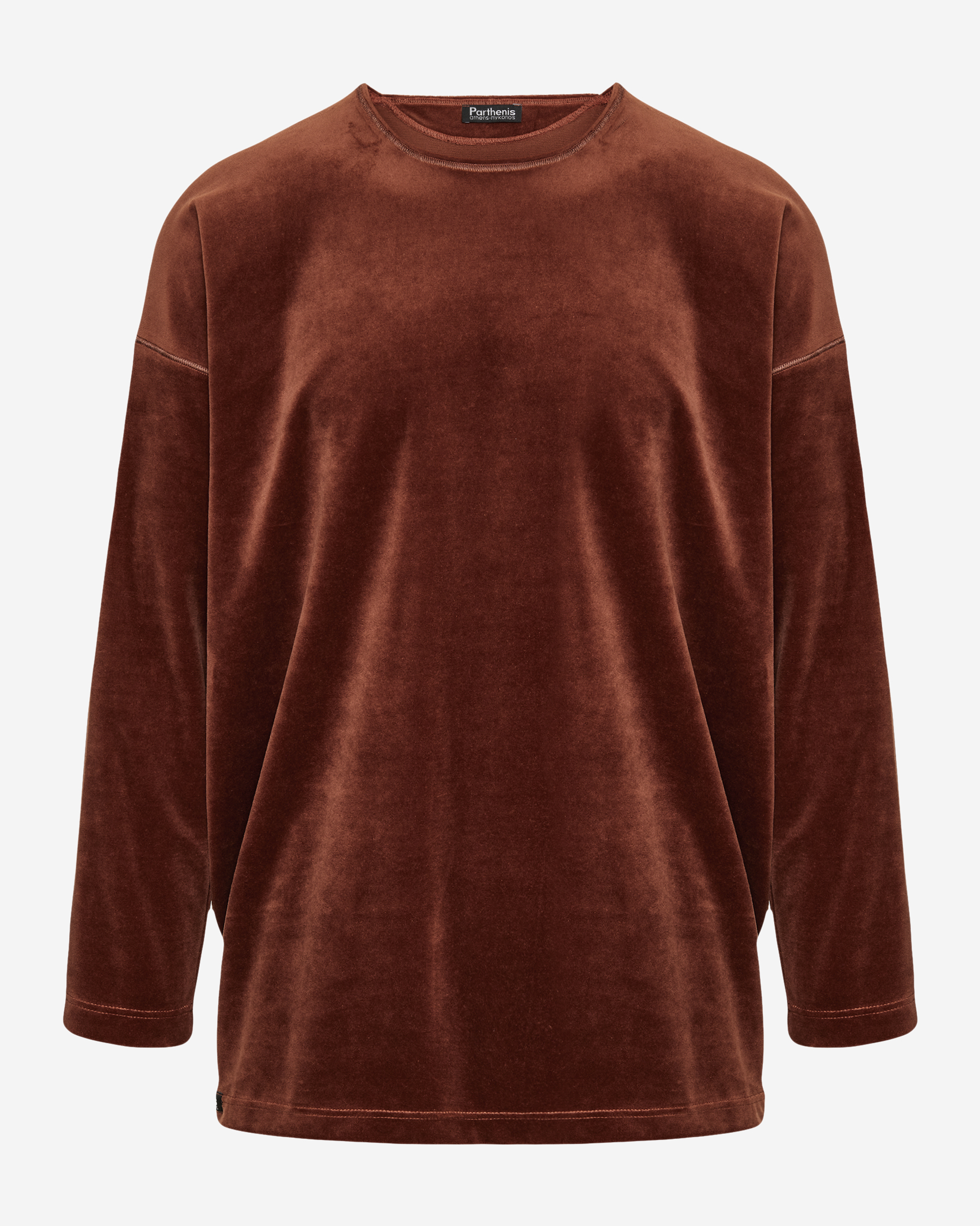 Πολύ φαρδιά μακρυμάνικη βελούδινη μπλούζα με διακοσμητικές ομοιόχρωμες ραφές. Η ετικέτα Parthenis Athens-Mykonos είναι ραμμένη εξωτερικά, στην δεξιά πλευρά του στριφώματος. Κατασκευάζεται στην Ελλάδα.