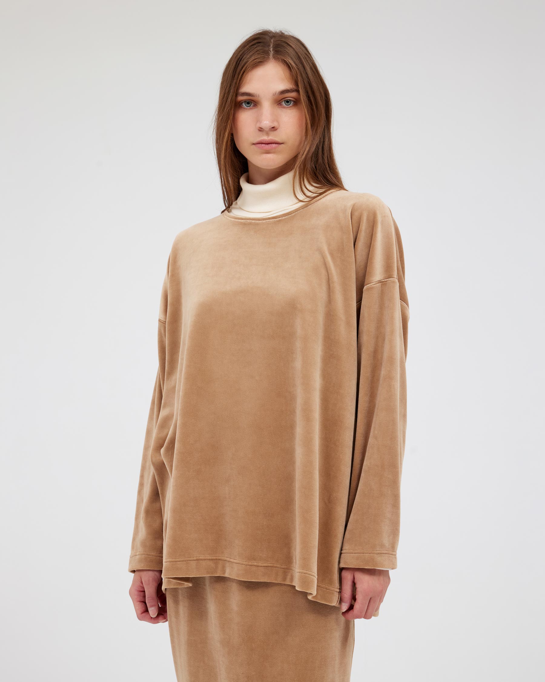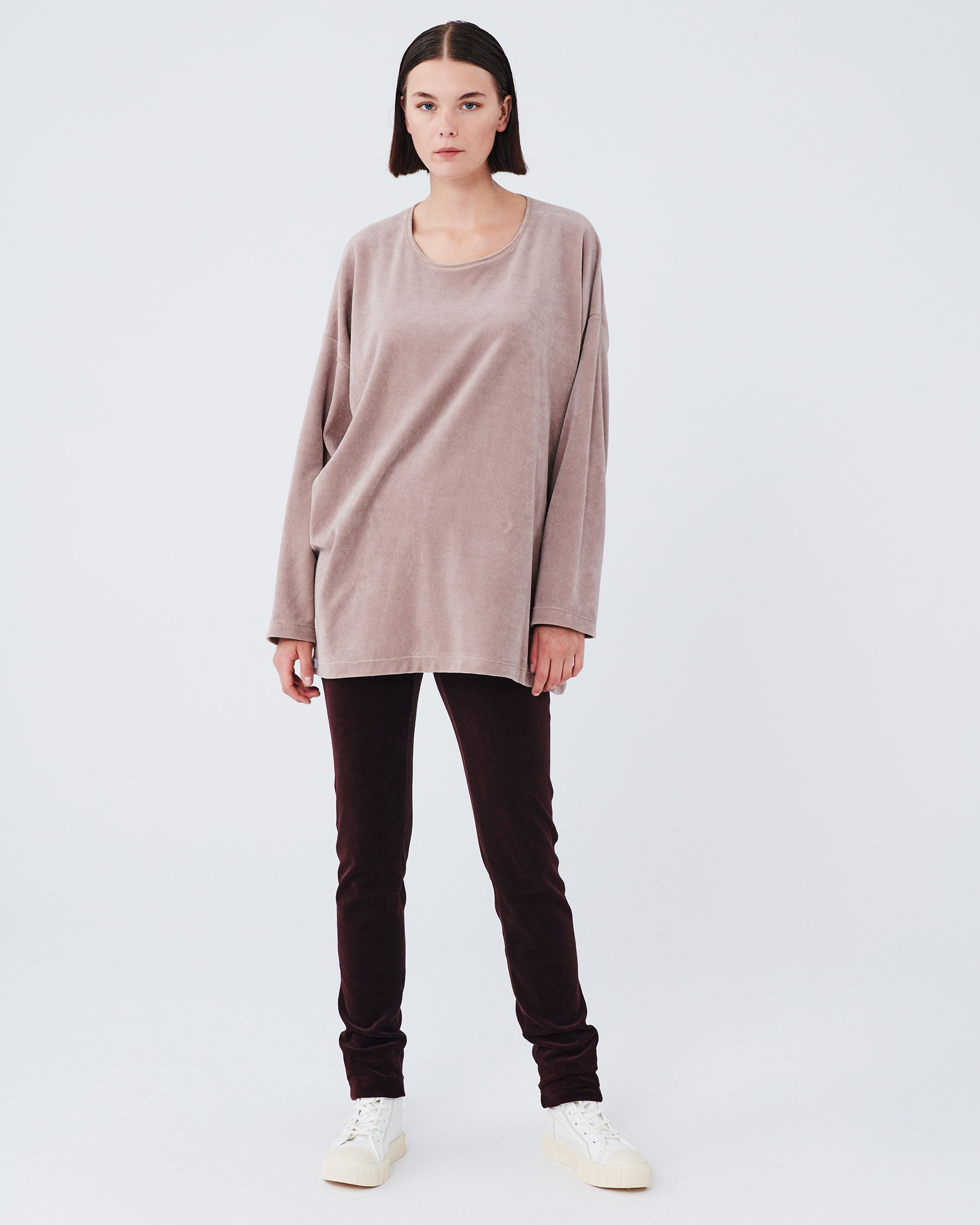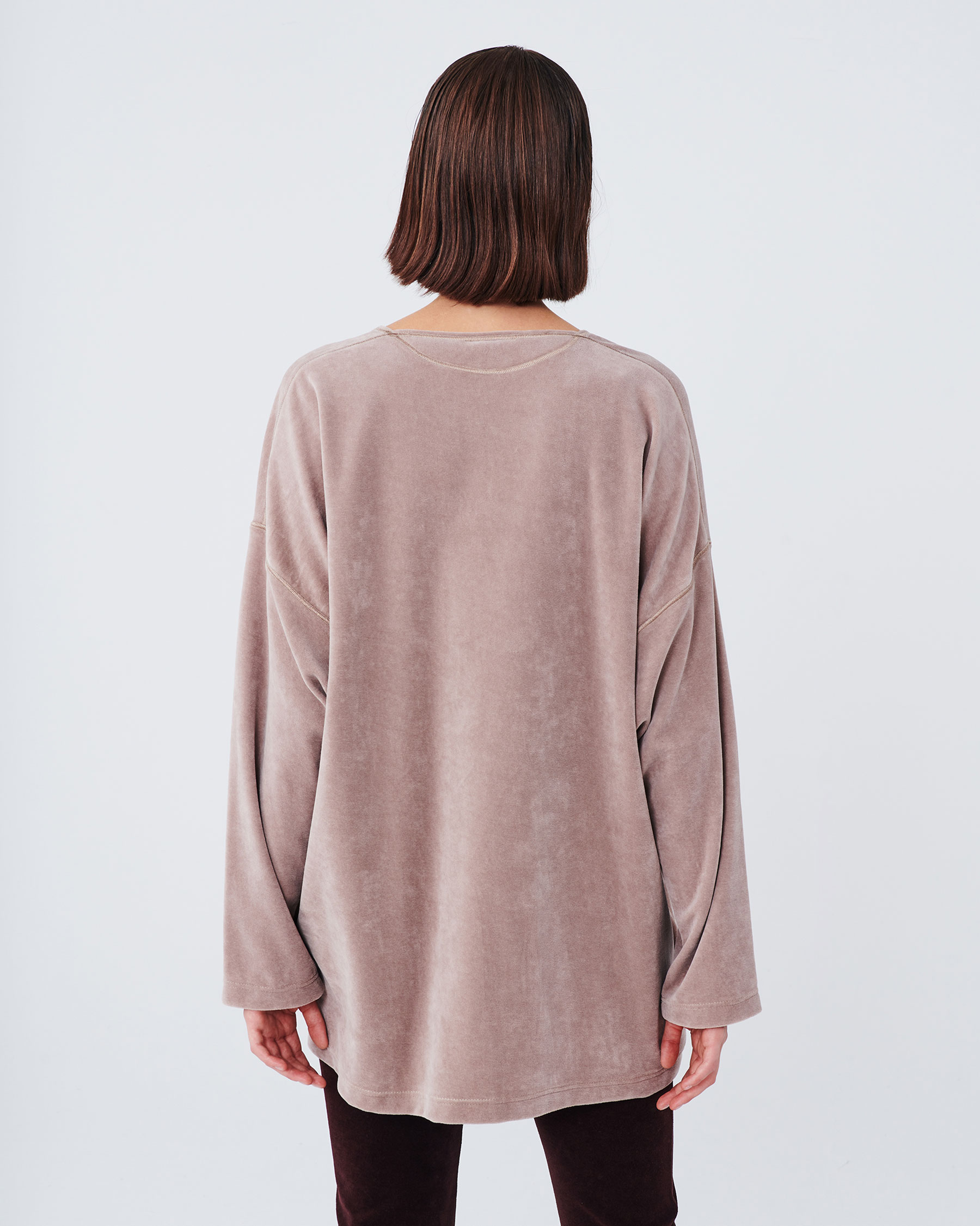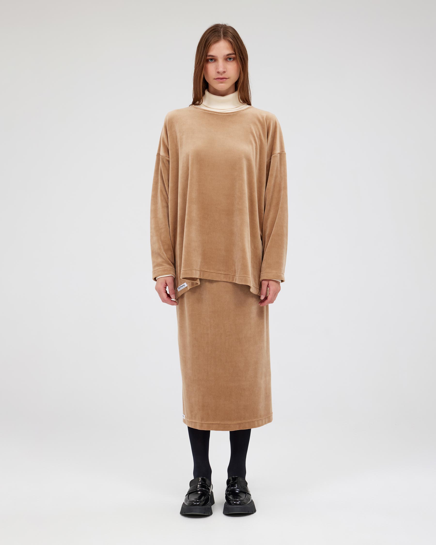 Πολύ φαρδιά μακρυμάνικη βελούδινη μπλούζα με διακοσμητικές ομοιόχρωμες ραφές. Η ετικέτα Parthenis Athens-Mykonos είναι ραμμένη εξωτερικά, στην δεξιά πλευρά του στριφώματος. Κατασκευάζεται στην Ελλάδα.