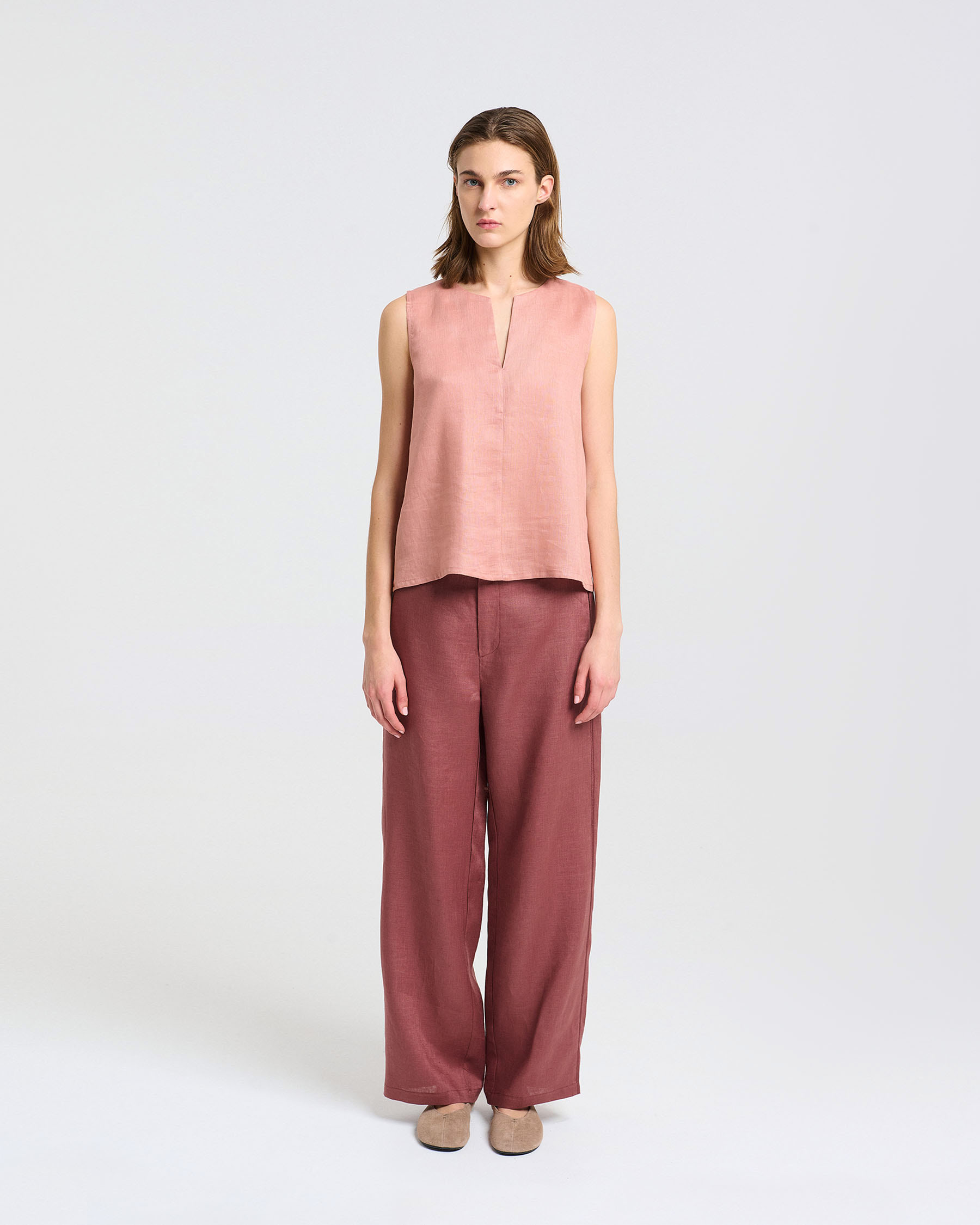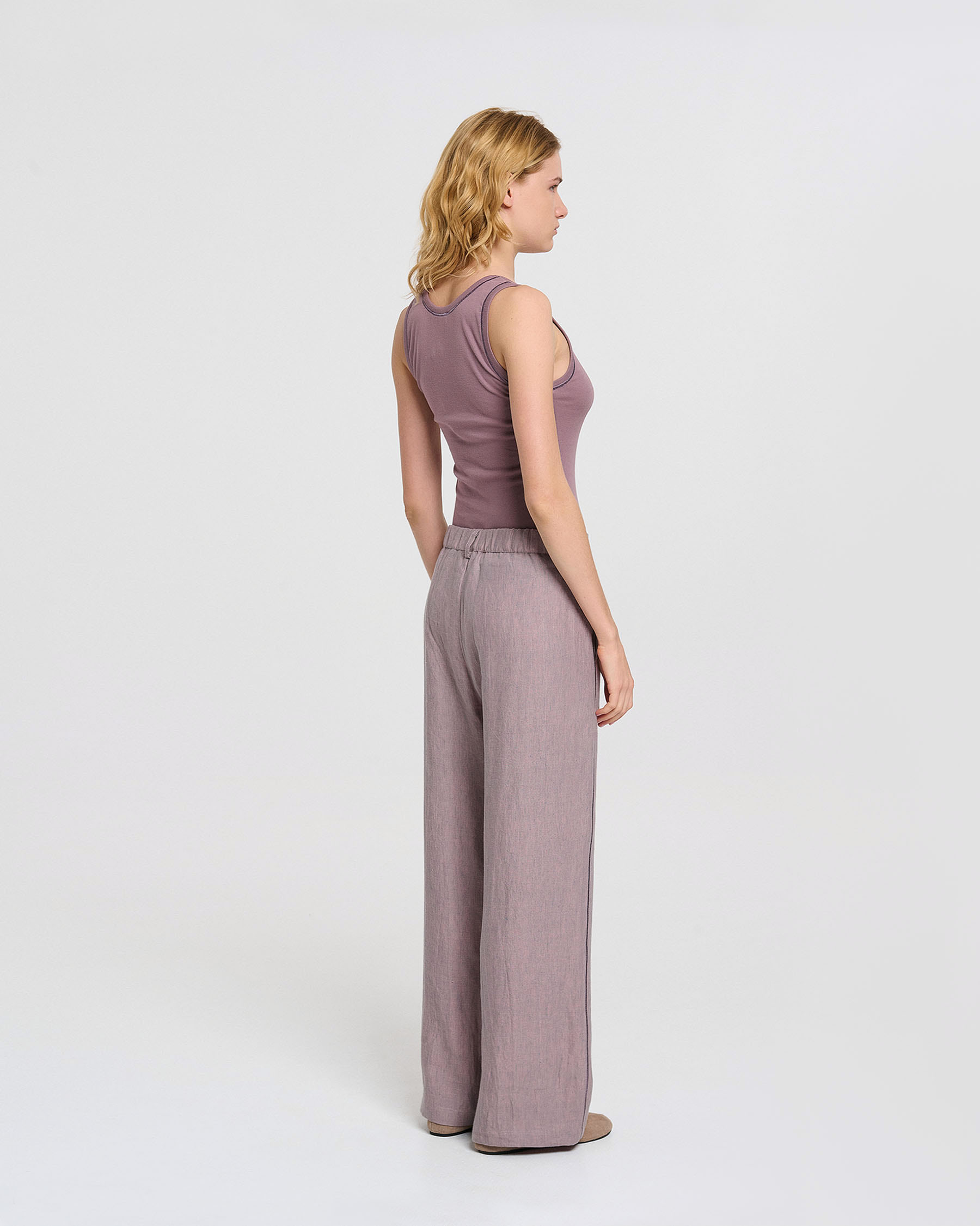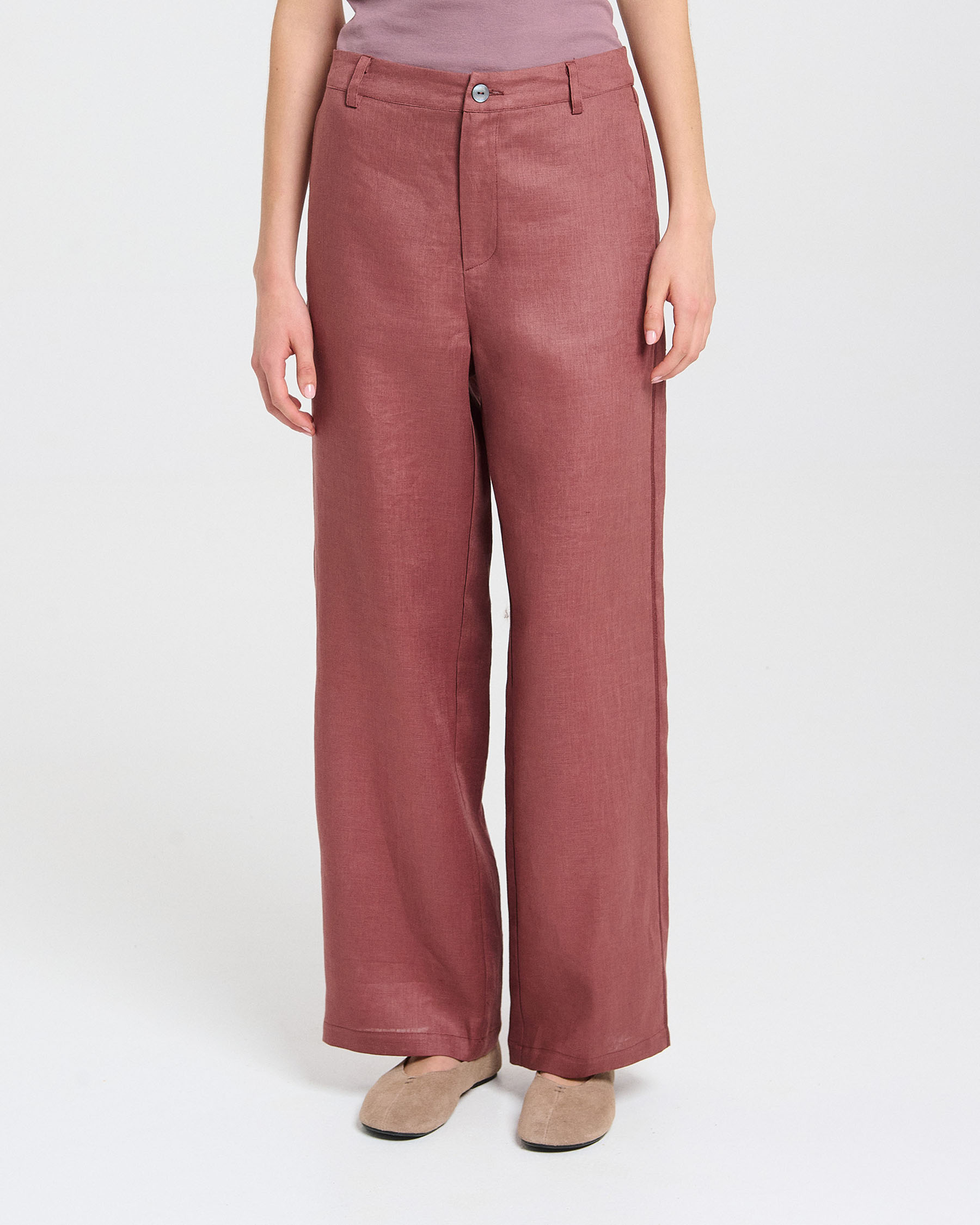 Linen straight-leg pants with side pockets, elastic waist at the back and front zipper. Made in Greece.