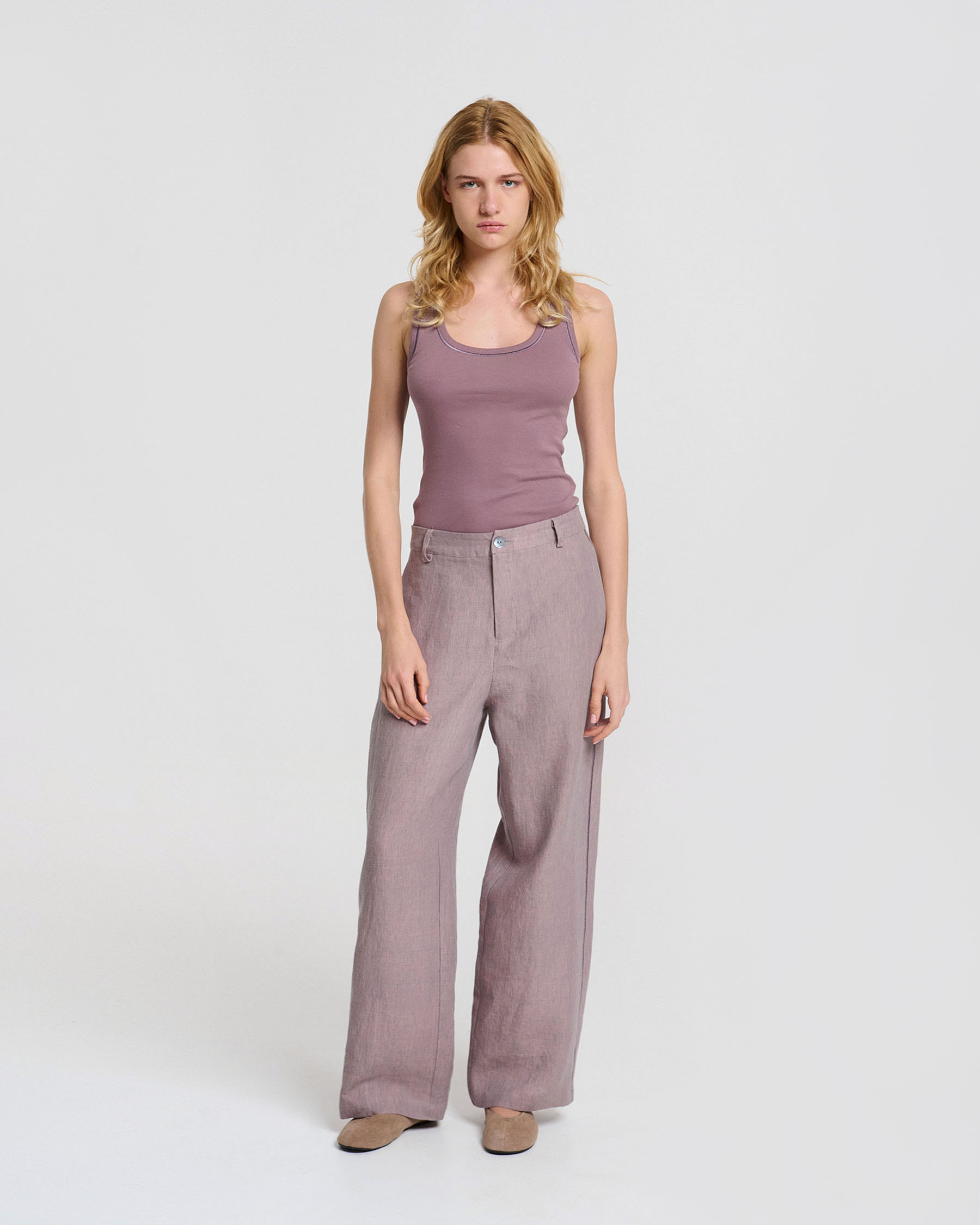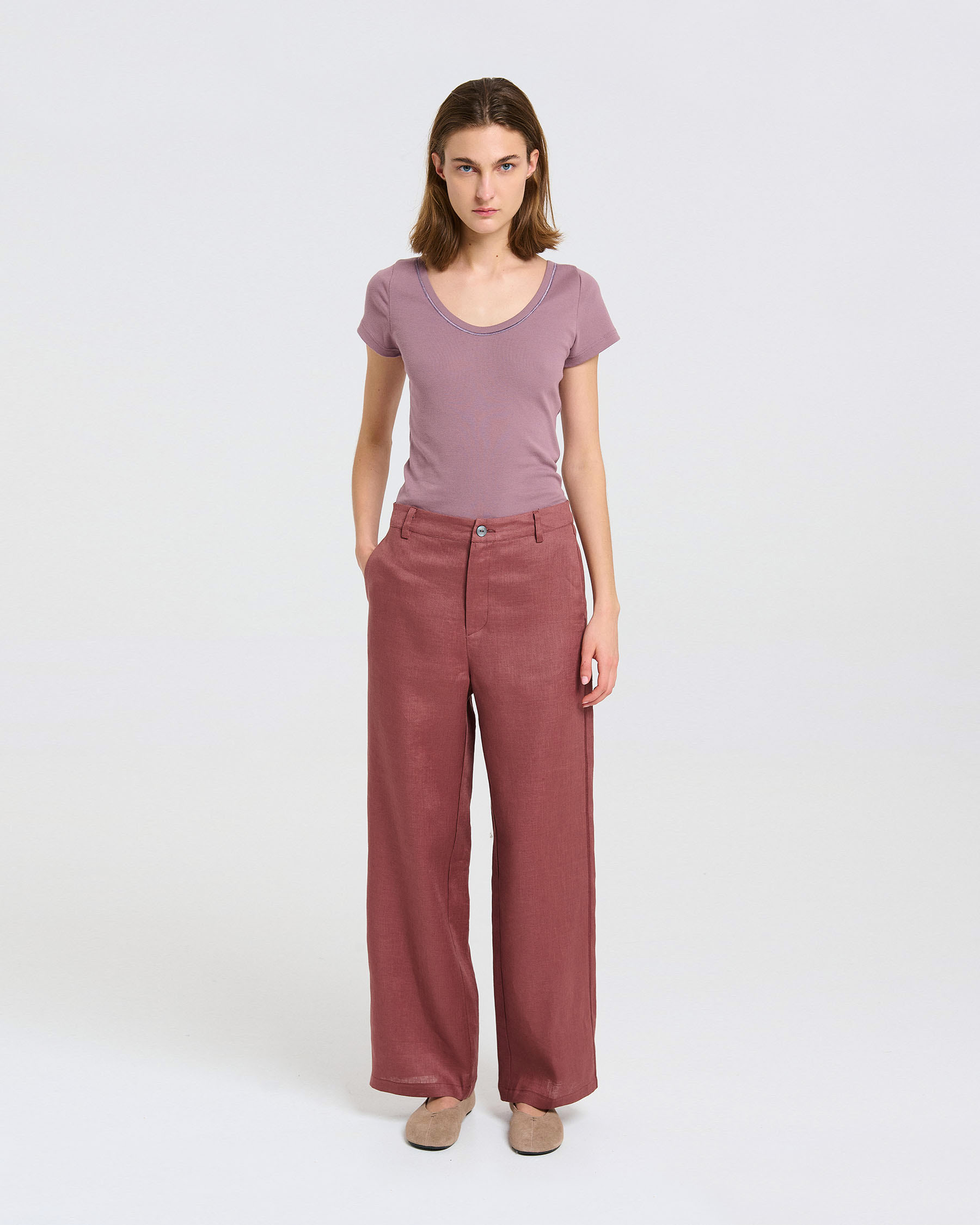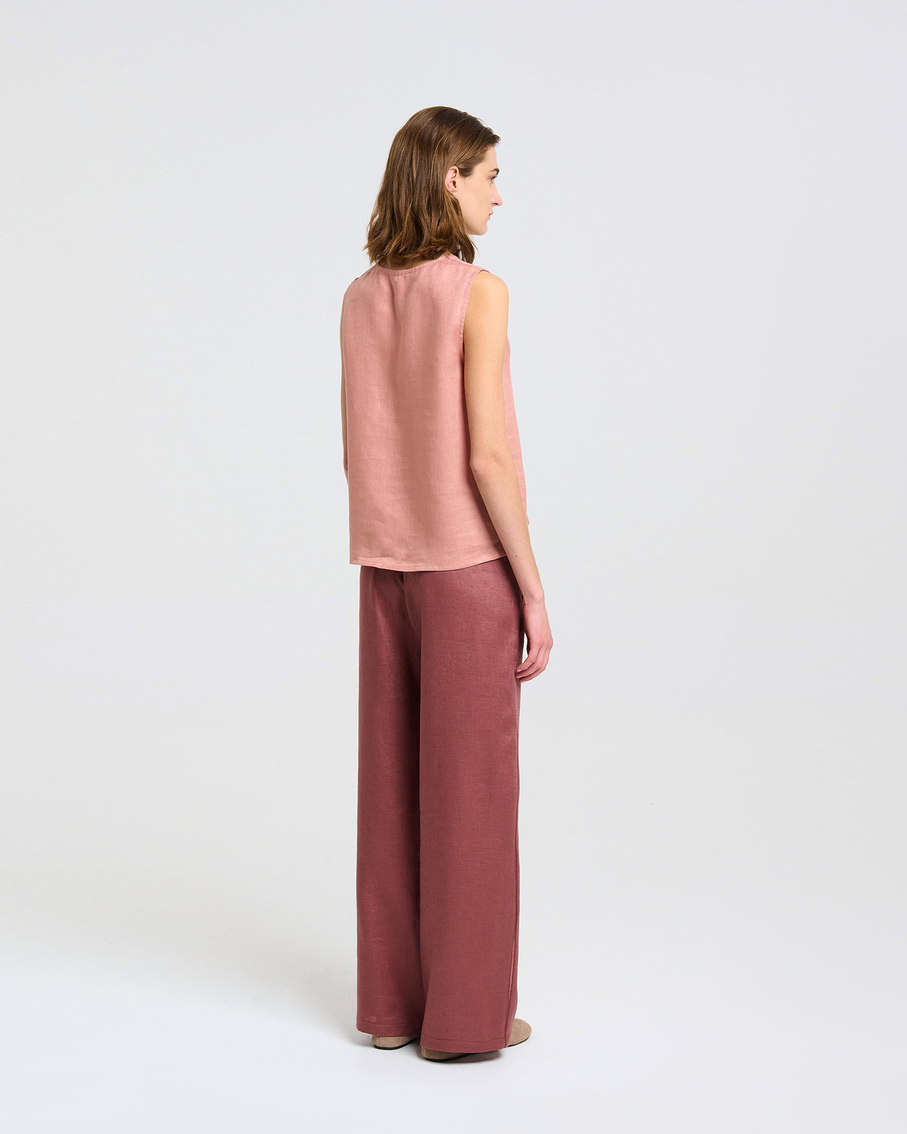 Linen straight-leg pants with side pockets, elastic waist at the back and front zipper. Made in Greece.