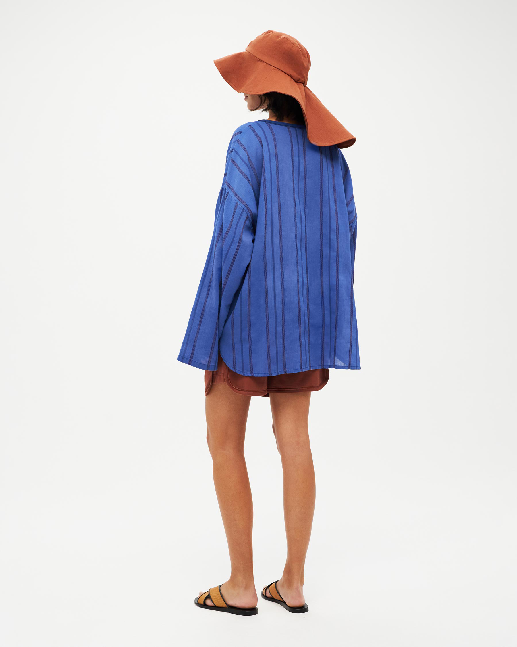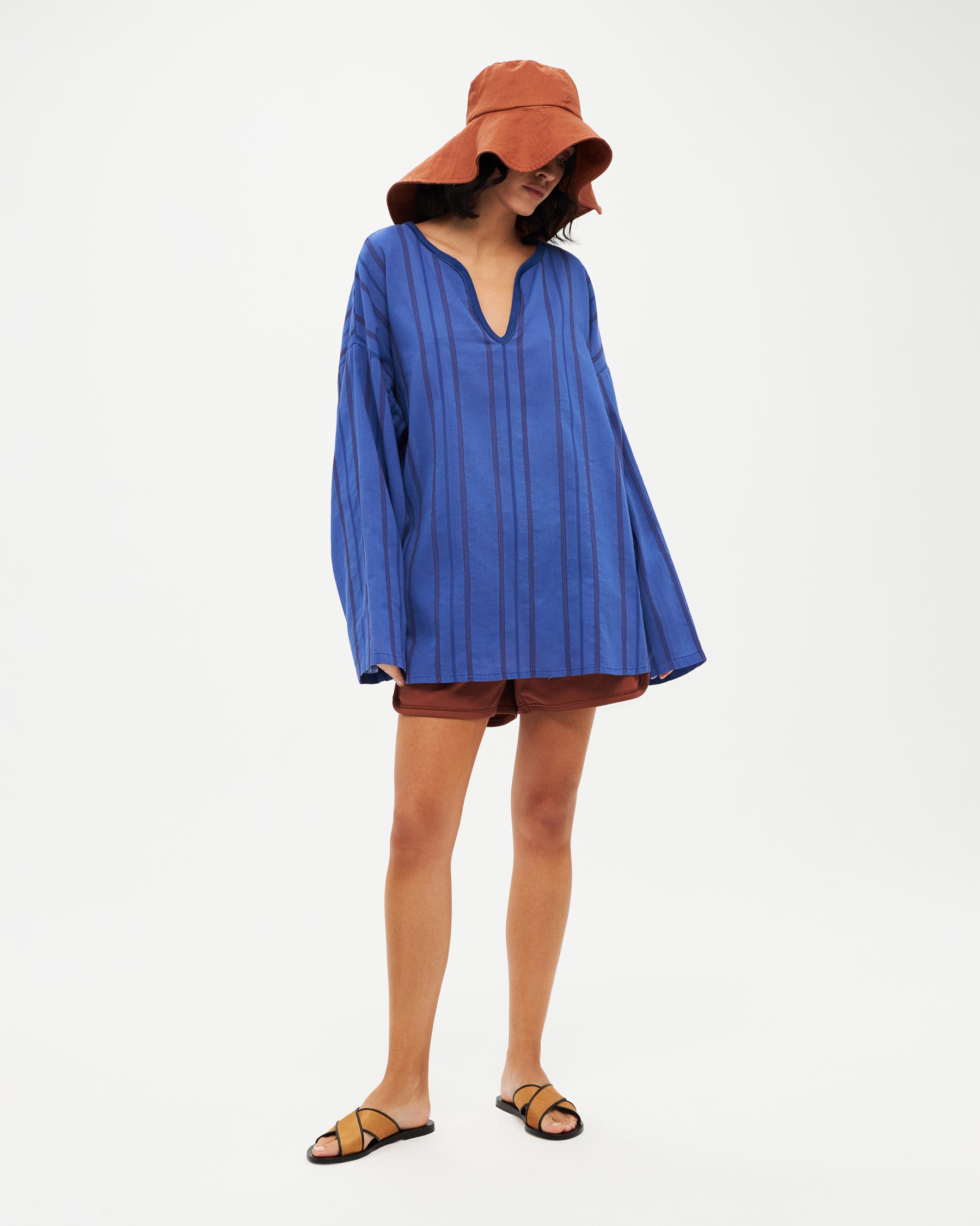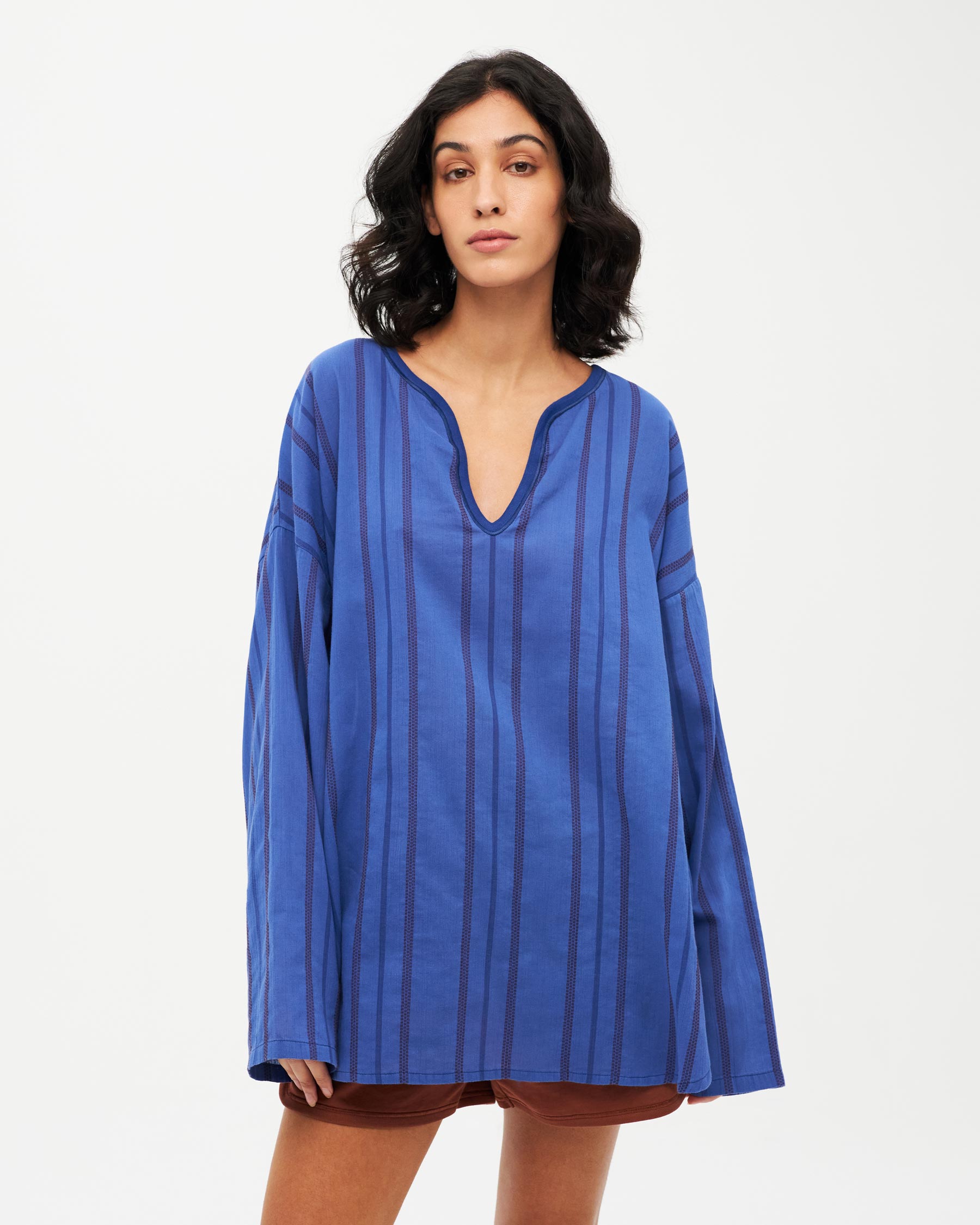 Long-sleeved striped loose top with front opening. Made in Greece.